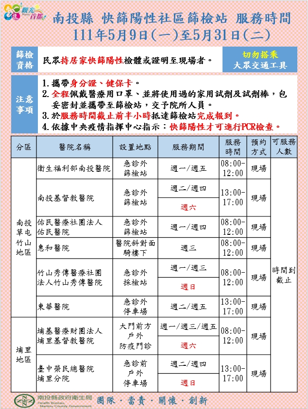 面對確診案升高,這二天民眾湧入電話,懷疑自已是否「中標」。衛生局表示,為避免醫院急診篩檢造成壅塞,影響醫療量能,已商請縣內南投醫院、南基醫院、佑民醫院、竹山秀傳醫院、東華醫院、惠和醫院、埔里基督教醫院、臺中榮民總醫院埔里分院等八家醫院,自5月9日起至5月31日開設社區篩檢站。