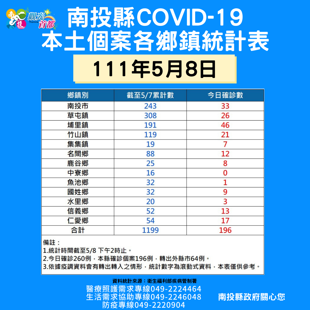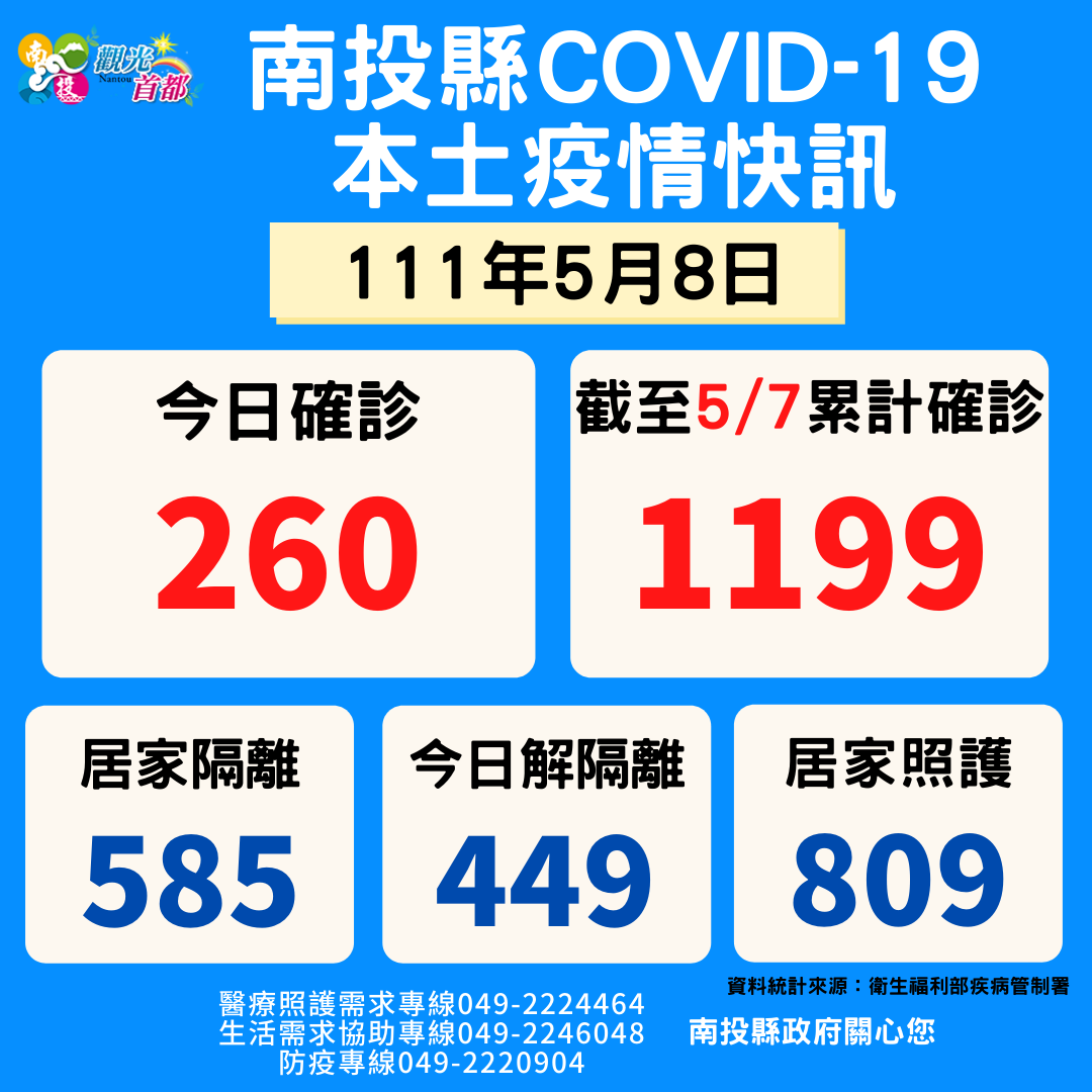 防疫宣傳 居家照護關懷手冊 防疫補助 勞工紓困 農漁畜牧 觀光紓困 企業紓困 租稅紓困 藝文紓困 中央各部會防疫專區 首頁 防疫宣傳 111年5月8日南投... 111年5月8日南投縣疫情快訊 公佈單位:新聞及行政處 發佈日期:111/5/9