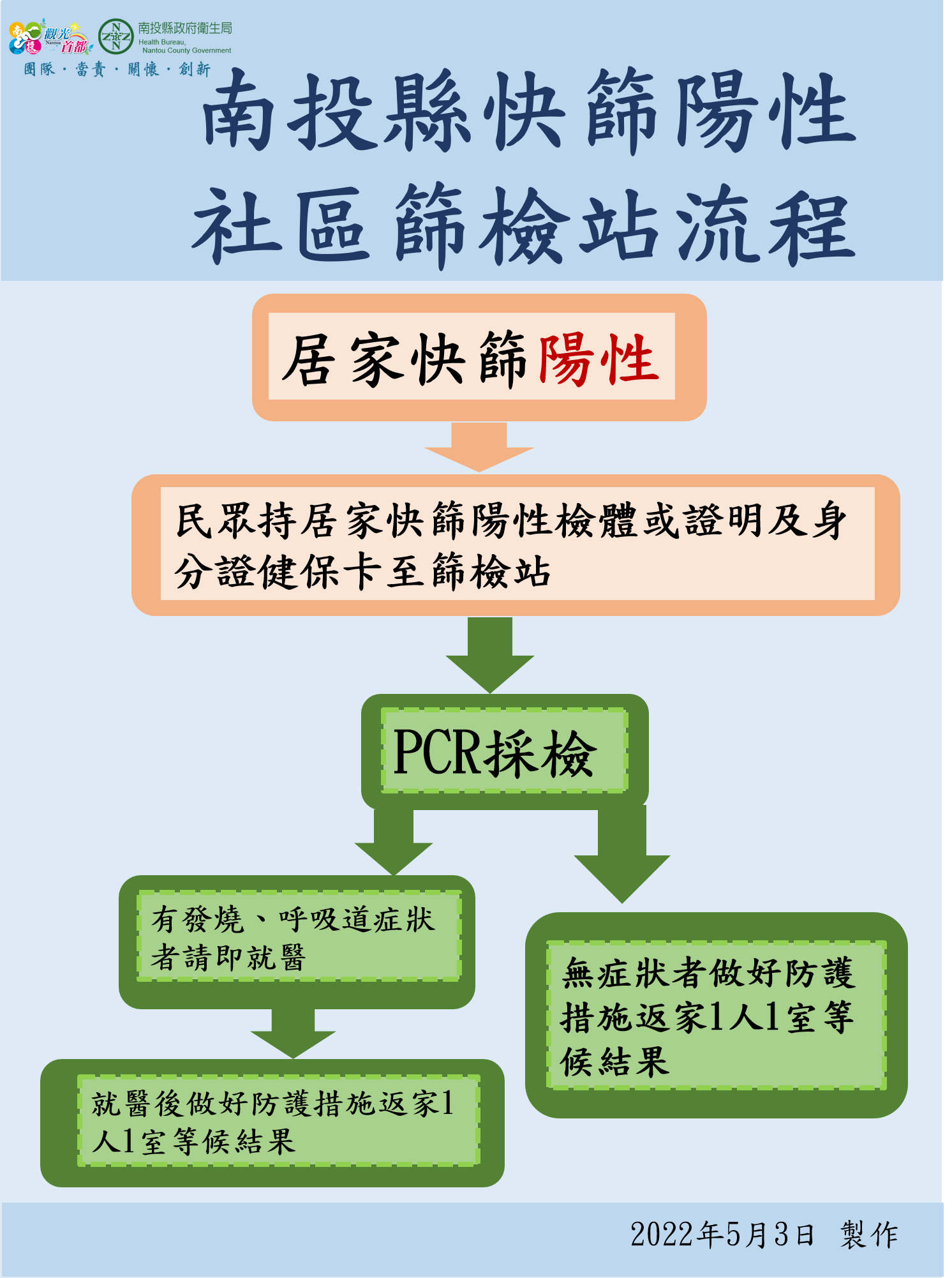 防疫宣傳 居家照護關懷手冊 防疫補助 勞工紓困 農漁畜牧 觀光紓困 企業紓困 租稅紓困 藝文紓困 中央各部會防疫專區 首頁 防疫宣傳 南投縣快篩陽性社區篩... 南投縣快篩陽性社區篩檢站流程 公佈單位:新聞及行政處 發佈日期:111/5/9