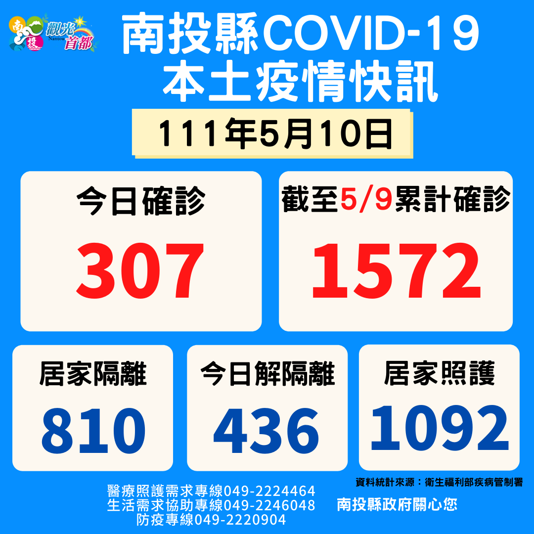 防疫宣傳 居家照護關懷手冊 防疫補助 勞工紓困 農漁畜牧 觀光紓困 企業紓困 租稅紓困 藝文紓困 中央各部會防疫專區 首頁 防疫宣傳 5月10日南投縣疫情... 5月10日南投縣疫情快訊 公佈單位:新聞及行政處 發佈日期:111/5/10
