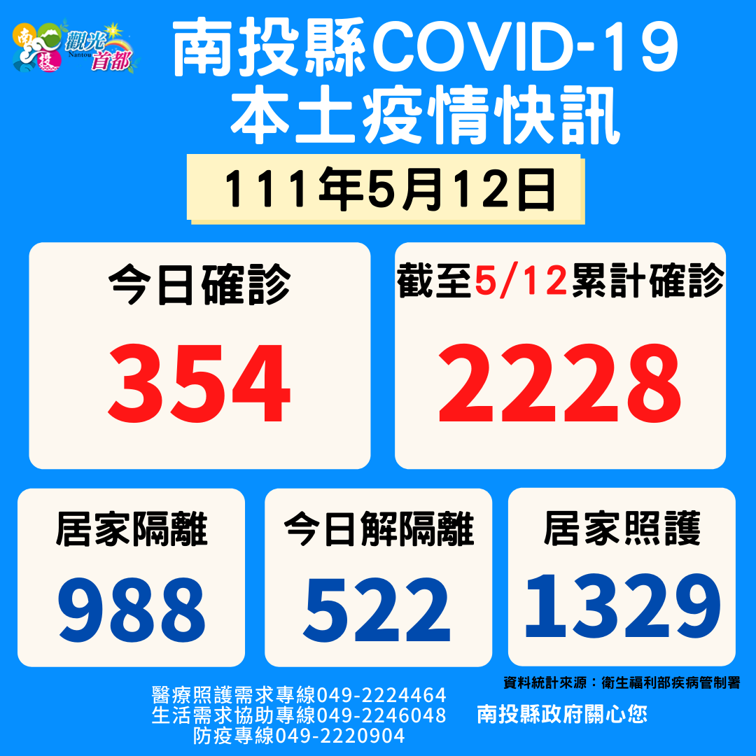 防疫宣傳 居家照護關懷手冊 防疫補助 勞工紓困 農漁畜牧 觀光紓困 企業紓困 租稅紓困 藝文紓困 中央各部會防疫專區 首頁 防疫宣傳 5月12日南投縣疫情... 5月12日南投縣疫情快訊 公佈單位:新聞及行政處 發佈日期:111/5/12