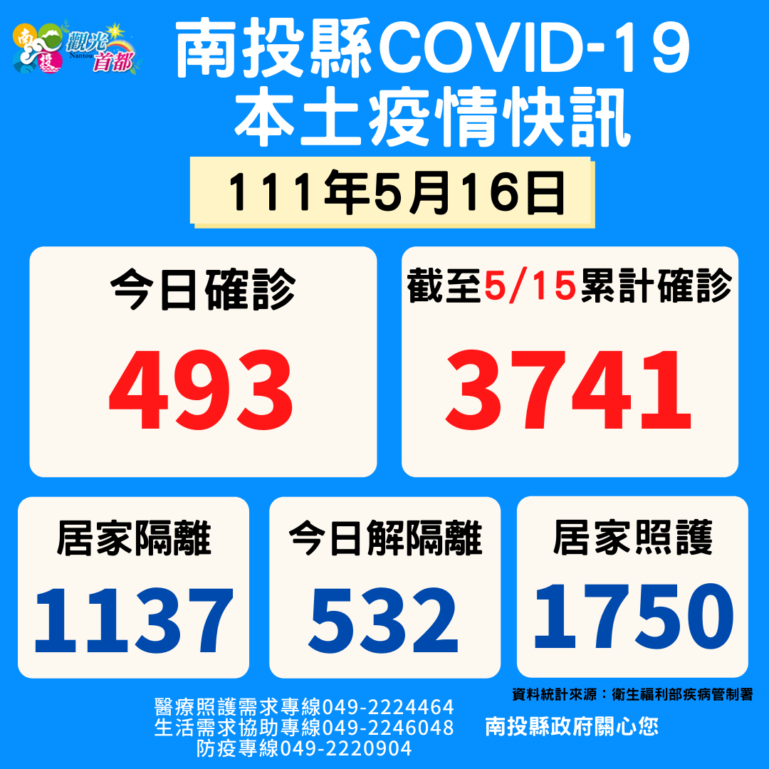 防疫宣傳 居家照護關懷手冊 防疫補助 勞工紓困 農漁畜牧 觀光紓困 企業紓困 租稅紓困 藝文紓困 中央各部會防疫專區 首頁 防疫宣傳 5月16日南投縣疫情... 5月16日南投縣疫情快訊 公佈單位:新聞及行政處 發佈日期:111/5/16