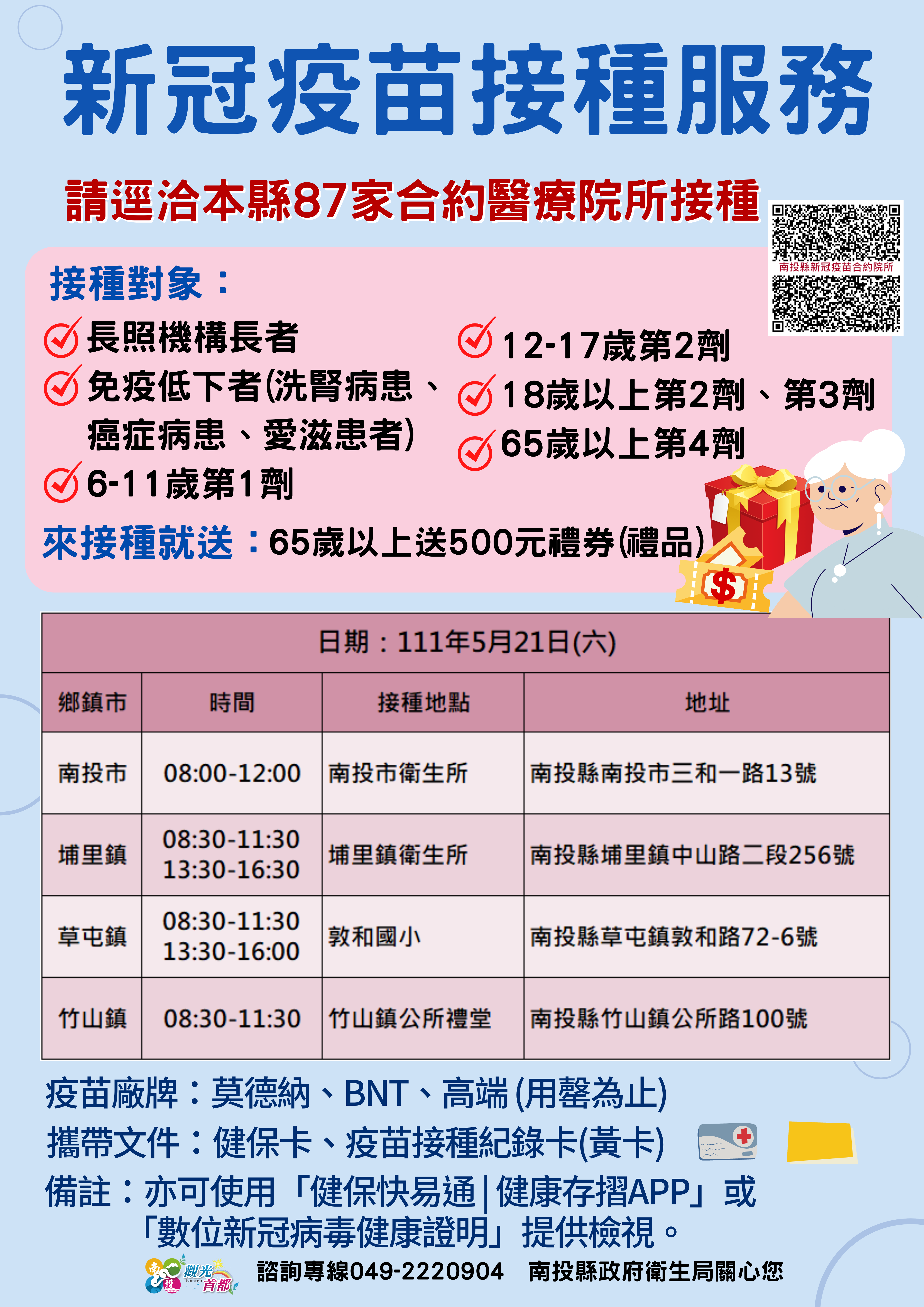 防疫宣傳 居家照護關懷手冊 防疫補助 勞工紓困 農漁畜牧 觀光紓困 企業紓困 租稅紓困 藝文紓困 中央各部會防疫專區 首頁 防疫宣傳 新冠疫苗接種服務 新冠疫苗接種服務 公佈單位:新聞及行政處 發佈日期:111/5/17