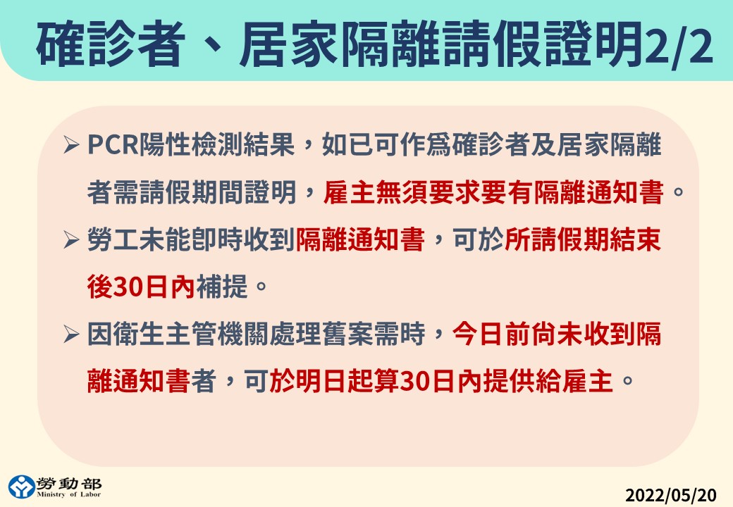 勞工請假時如還沒收到隔離通知書,可先以健保快易通APP或數位新冠病毒健康證明的陽性檢測結果作為證明,這些文件如果已經可以證明勞工請假理由及日數,不一定要有隔離通知書;如果還是不能佐證的話,最晚可在請假結束後30日內(亦即,最後一日請假日之翌日起算30日內),向雇主補提供隔離通知書。勞雇雙方如因請假證明事項有所爭議,可請縣府社勞處協助處理。