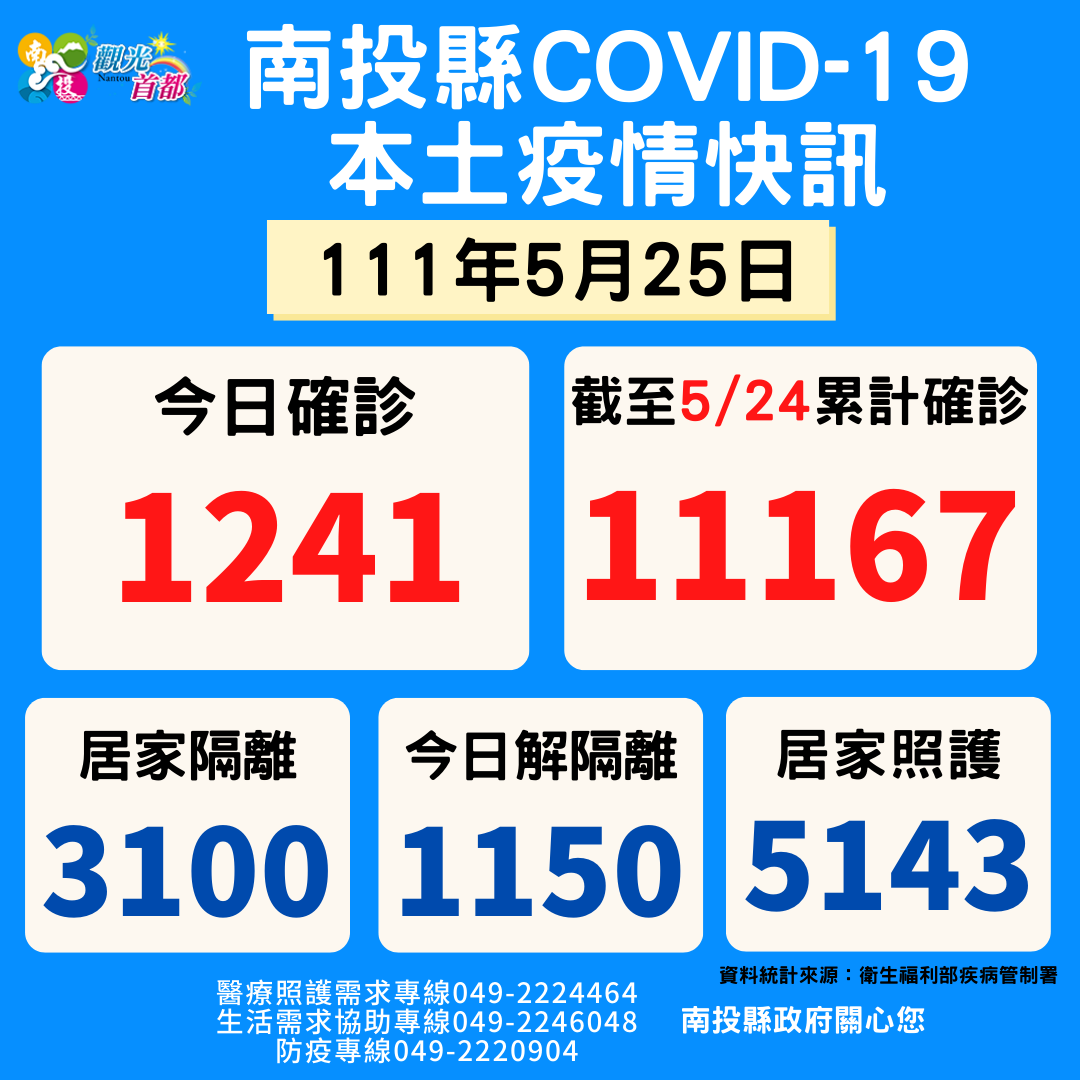 防疫宣傳 居家照護關懷手冊 防疫補助 勞工紓困 農漁畜牧 觀光紓困 企業紓困 租稅紓困 藝文紓困 中央各部會防疫專區 首頁 防疫宣傳 5月25日南投縣疫情... 5月25日南投縣疫情快訊 公佈單位:新聞及行政處 發佈日期:111/5/25