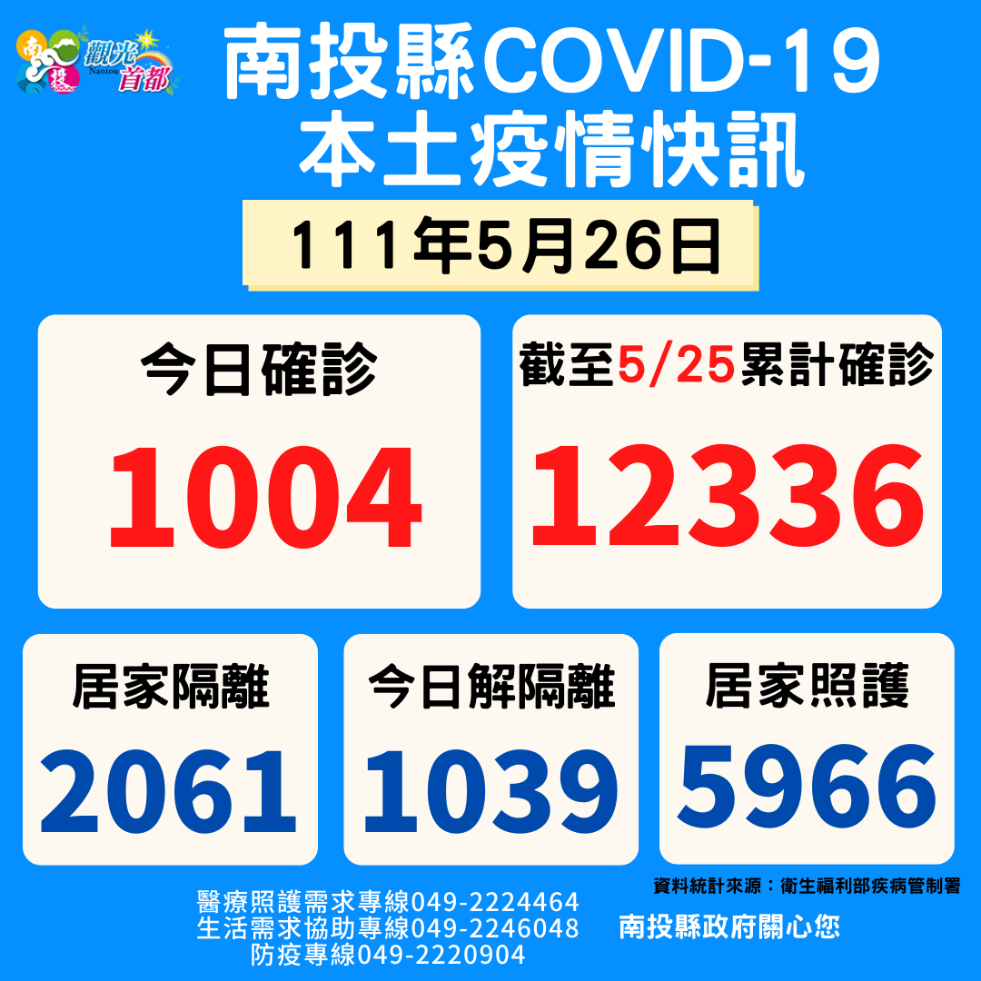 防疫宣傳 居家照護關懷手冊 防疫補助 勞工紓困 農漁畜牧 觀光紓困 企業紓困 租稅紓困 藝文紓困 中央各部會防疫專區 首頁 防疫宣傳 5月26日南投縣疫情... 5月26日南投縣疫情快訊 公佈單位:新聞及行政處 發佈日期:111/5/26