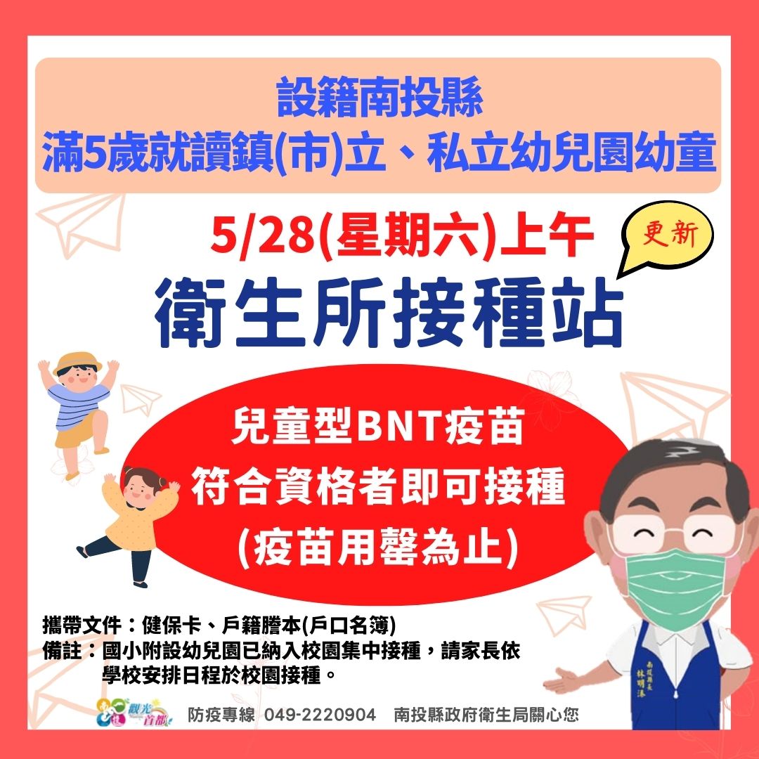 中央流行疫情指揮中心今(5/27)公布南投縣確診人數1,330例,截至5/26累計確診人數13,307例,居家隔離人數2,692例,今日已解除隔離1,209例,居家照護人數7,335例,南投縣各鄉鎮確診人數即時訊息詳見https://reurl.cc/2ZWkKO 。 衛生局長陳南松表示,疫情緊張,防疫上緊發條。縣府衛生局明(28日)針對設籍南投縣,就讀私立及鎮立幼兒園,且年齡在5歲以上,進行幼童BNT疫苗注射;由於連續下雨,雨天路滑,衛生局通知各衛生所特別注意民眾安全,現場秩序及動線作業安排及標示清楚。原南投市接種站也決定移至南投慈濟連絡處。