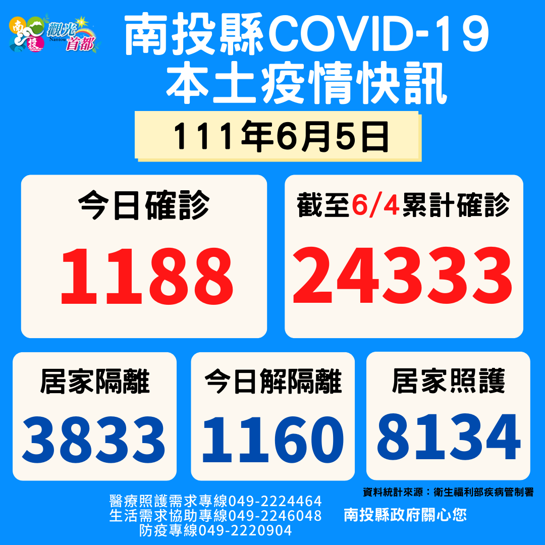 防疫宣傳 居家照護關懷手冊 防疫補助 勞工紓困 農漁畜牧 觀光紓困 企業紓困 租稅紓困 藝文紓困 中央各部會防疫專區 首頁 防疫宣傳 6月5日南投縣疫情快... 6月5日南投縣疫情快訊 公佈單位:新聞及行政處 發佈日期:111/6/5
