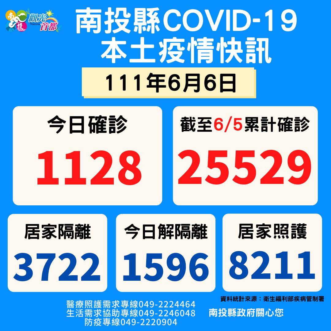 防疫宣傳 居家照護關懷手冊 防疫補助 勞工紓困 農漁畜牧 觀光紓困 企業紓困 租稅紓困 藝文紓困 中央各部會防疫專區 首頁 防疫宣傳 6月6日南投縣疫情快... 6月6日南投縣疫情快訊 公佈單位:新聞及行政處 發佈日期:111/6/6
