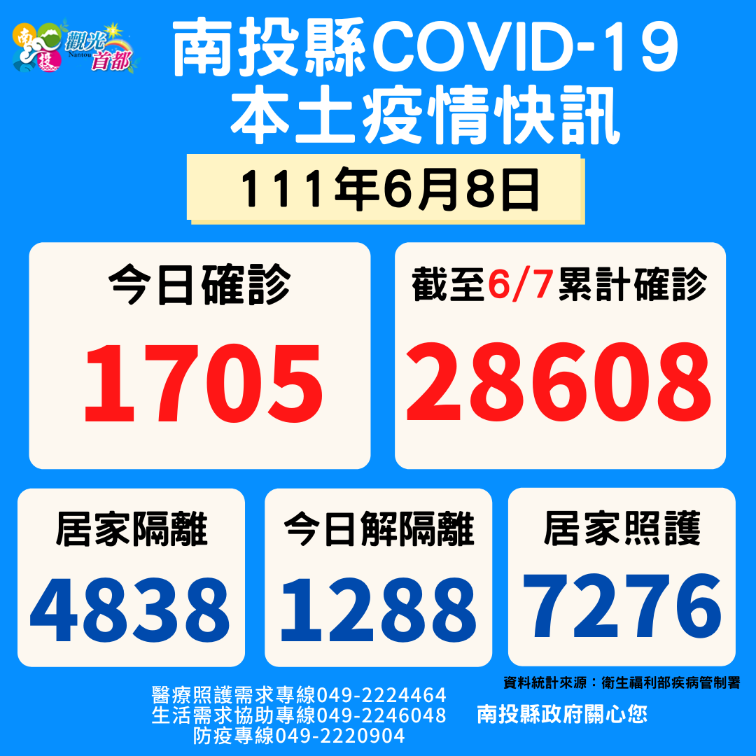 防疫宣傳 居家照護關懷手冊 防疫補助 勞工紓困 農漁畜牧 觀光紓困 企業紓困 租稅紓困 藝文紓困 中央各部會防疫專區 首頁 防疫宣傳 6月8日南投縣疫情快... 6月8日南投縣疫情快訊 公佈單位:新聞及行政處 發佈日期:111/6/8
