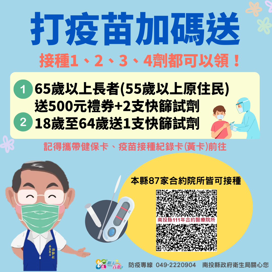防疫宣傳 居家照護關懷手冊 防疫補助 勞工紓困 農漁畜牧 觀光紓困 企業紓困 租稅紓困 藝文紓困 中央各部會防疫專區 首頁 防疫宣傳 打疫苗加碼送 打疫苗加碼送 公佈單位:新聞及行政處 發佈日期:111/6/9