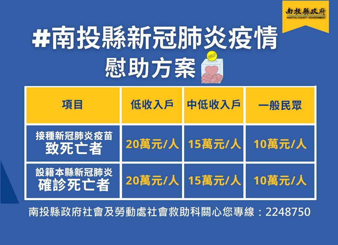 縣長林明溱表示,民眾染疫身亡,令人不捨,希望家屬節哀。縣府比照施打新冠疫苗死亡慰助方案,設籍南投縣新冠肺炎確診死亡者,列冊低收入戶發給20萬元慰助金,中低收入戶15萬元,一般民眾10萬元。