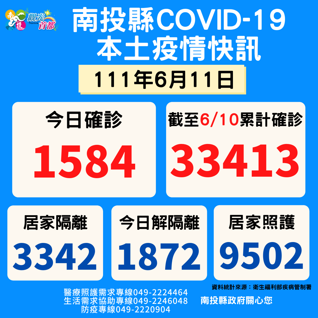 防疫宣傳 居家照護關懷手冊 防疫補助 勞工紓困 農漁畜牧 觀光紓困 企業紓困 租稅紓困 藝文紓困 中央各部會防疫專區 首頁 防疫宣傳 6月11日南投縣疫情... 6月11日南投縣疫情快訊 公佈單位:新聞及行政處 發佈日期:111/6/11