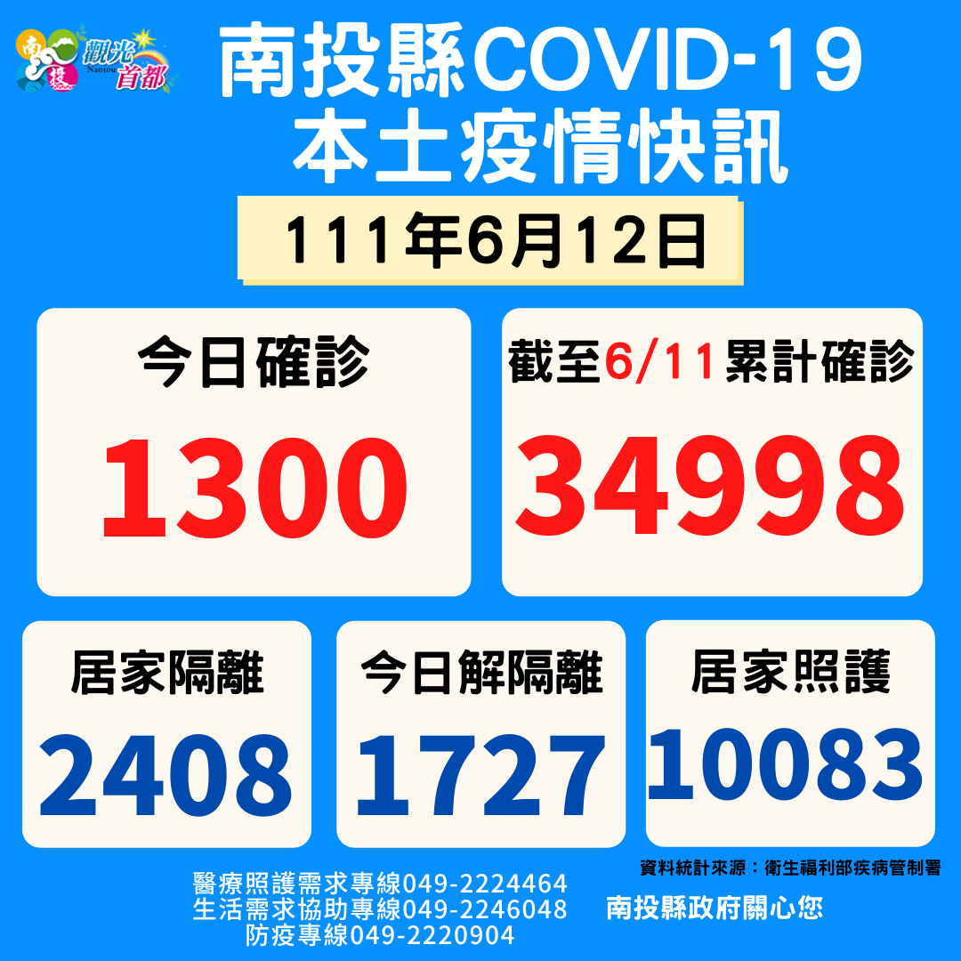 防疫宣傳 居家照護關懷手冊 防疫補助 勞工紓困 農漁畜牧 觀光紓困 企業紓困 租稅紓困 藝文紓困 中央各部會防疫專區 首頁 防疫宣傳 6月12日南投縣疫情... 6月12日南投縣疫情快訊 公佈單位:新聞及行政處 發佈日期:111/6/12