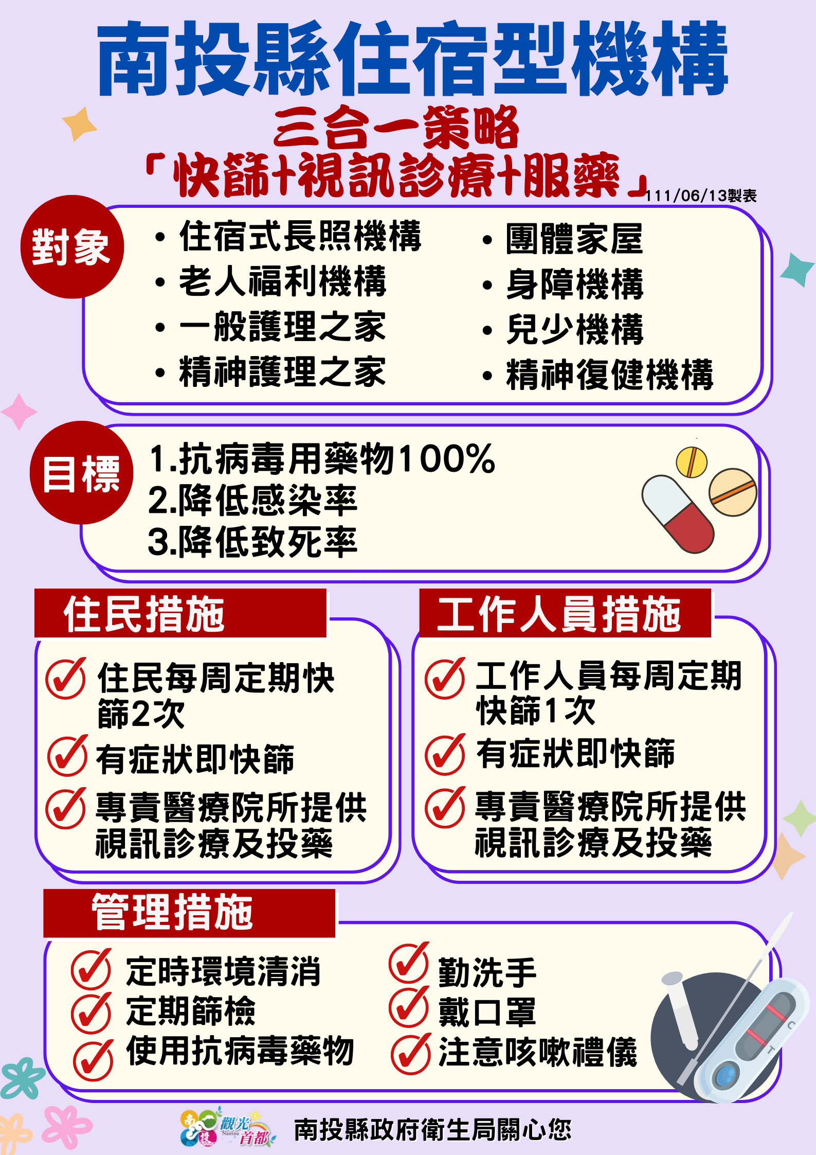 防疫宣傳 居家照護關懷手冊 防疫補助 勞工紓困 農漁畜牧 觀光紓困 企業紓困 租稅紓困 藝文紓困 中央各部會防疫專區 首頁 防疫宣傳 南投縣住宿式長照機構 南投縣住宿式長照機構 公佈單位:新聞及行政處 發佈日期:111/6/13