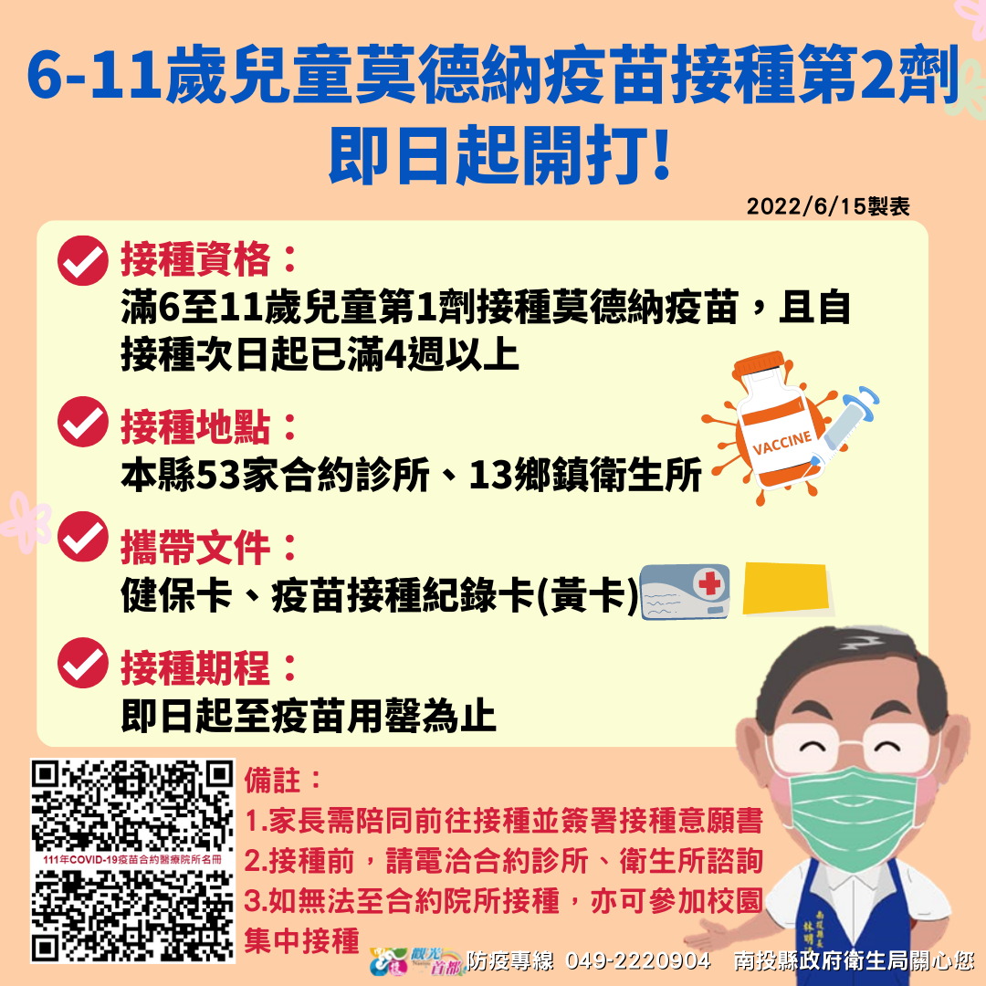 防疫宣傳 居家照護關懷手冊 防疫補助 勞工紓困 農漁畜牧 觀光紓困 企業紓困 租稅紓困 藝文紓困 中央各部會防疫專區 首頁 防疫宣傳 6-11歲兒童莫德納... 6-11歲兒童莫德納疫苗接種第2劑 即日起開打! 公佈單位:新聞及行政處 發佈日期:111/6/16