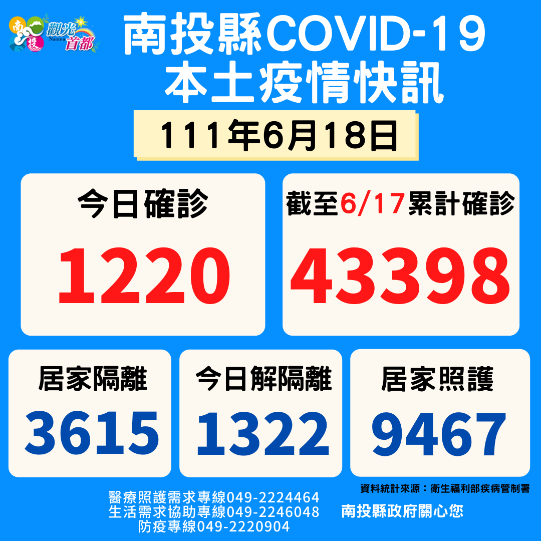 防疫宣傳 居家照護關懷手冊 防疫補助 勞工紓困 農漁畜牧 觀光紓困 企業紓困 租稅紓困 藝文紓困 中央各部會防疫專區 首頁 防疫宣傳 6月18南投縣疫情快... 6月18南投縣疫情快訊 公佈單位:新聞及行政處 發佈日期:111/6/19
