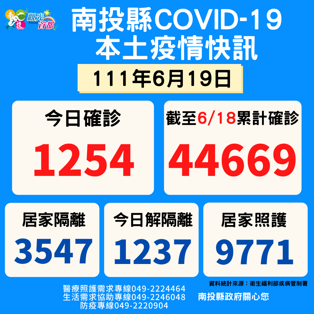 防疫宣傳 居家照護關懷手冊 防疫補助 勞工紓困 農漁畜牧 觀光紓困 企業紓困 租稅紓困 藝文紓困 中央各部會防疫專區 首頁 防疫宣傳 6月19日南投縣疫情... 6月19日南投縣疫情快訊 公佈單位:新聞及行政處 發佈日期:111/6/19