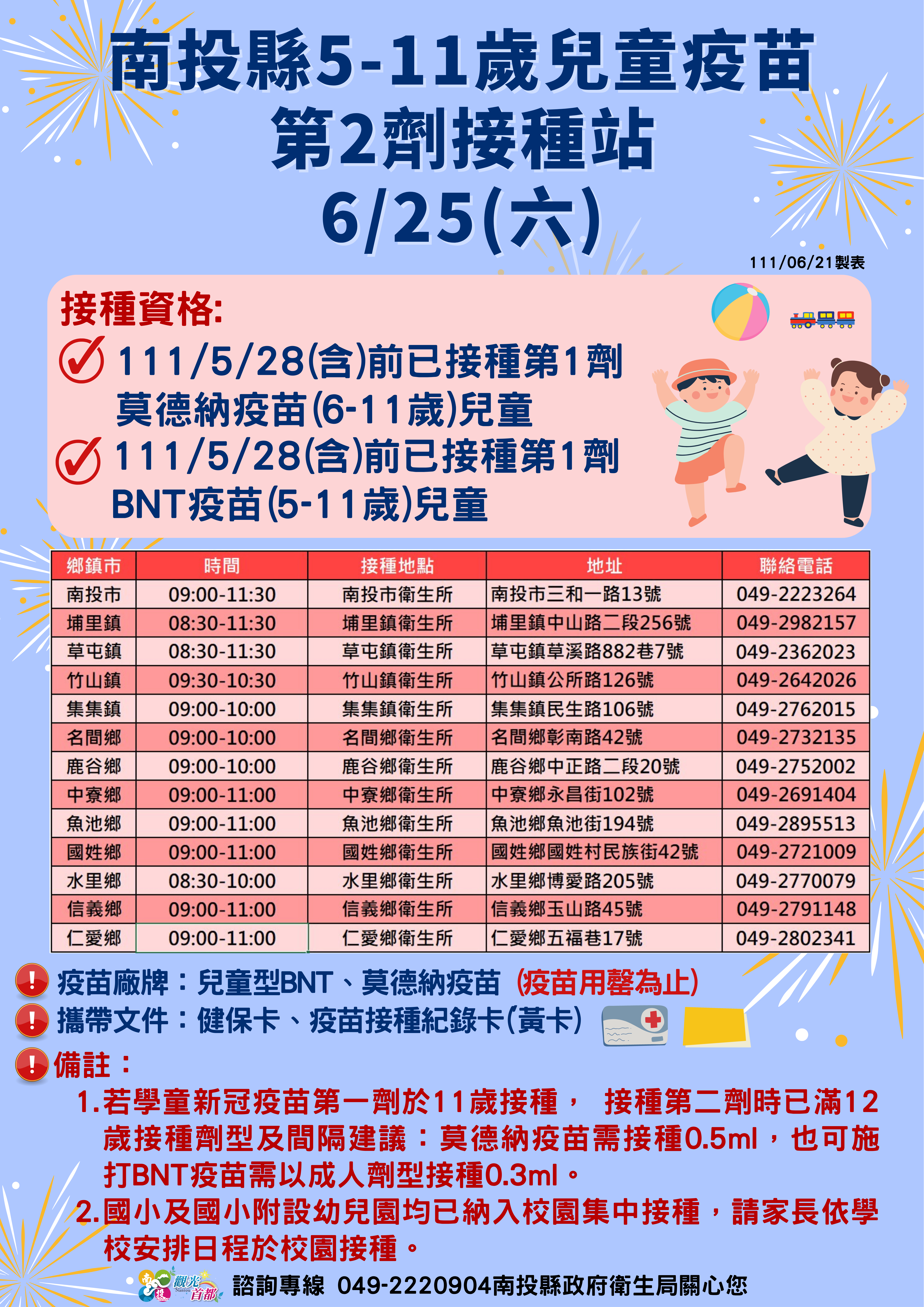 防疫宣傳 居家照護關懷手冊 防疫補助 勞工紓困 農漁畜牧 觀光紓困 企業紓困 租稅紓困 藝文紓困 中央各部會防疫專區 首頁 防疫宣傳 南投縣5-11歲兒童... 南投縣5-11歲兒童疫苗第2劑接種站6/25(六) 公佈單位:新聞及行政處 發佈日期:111/6/21