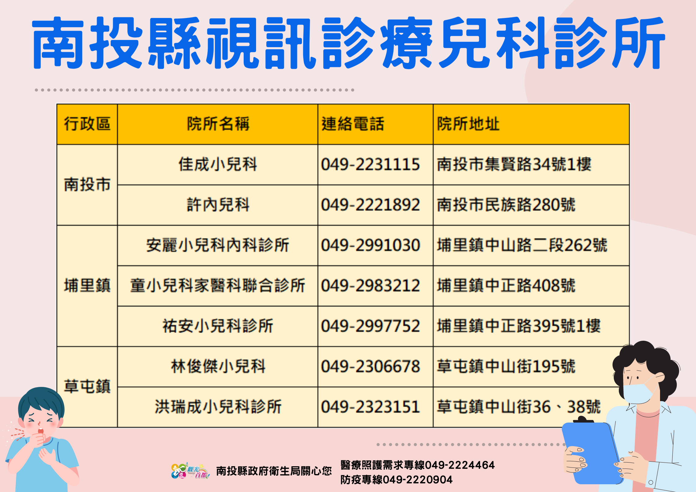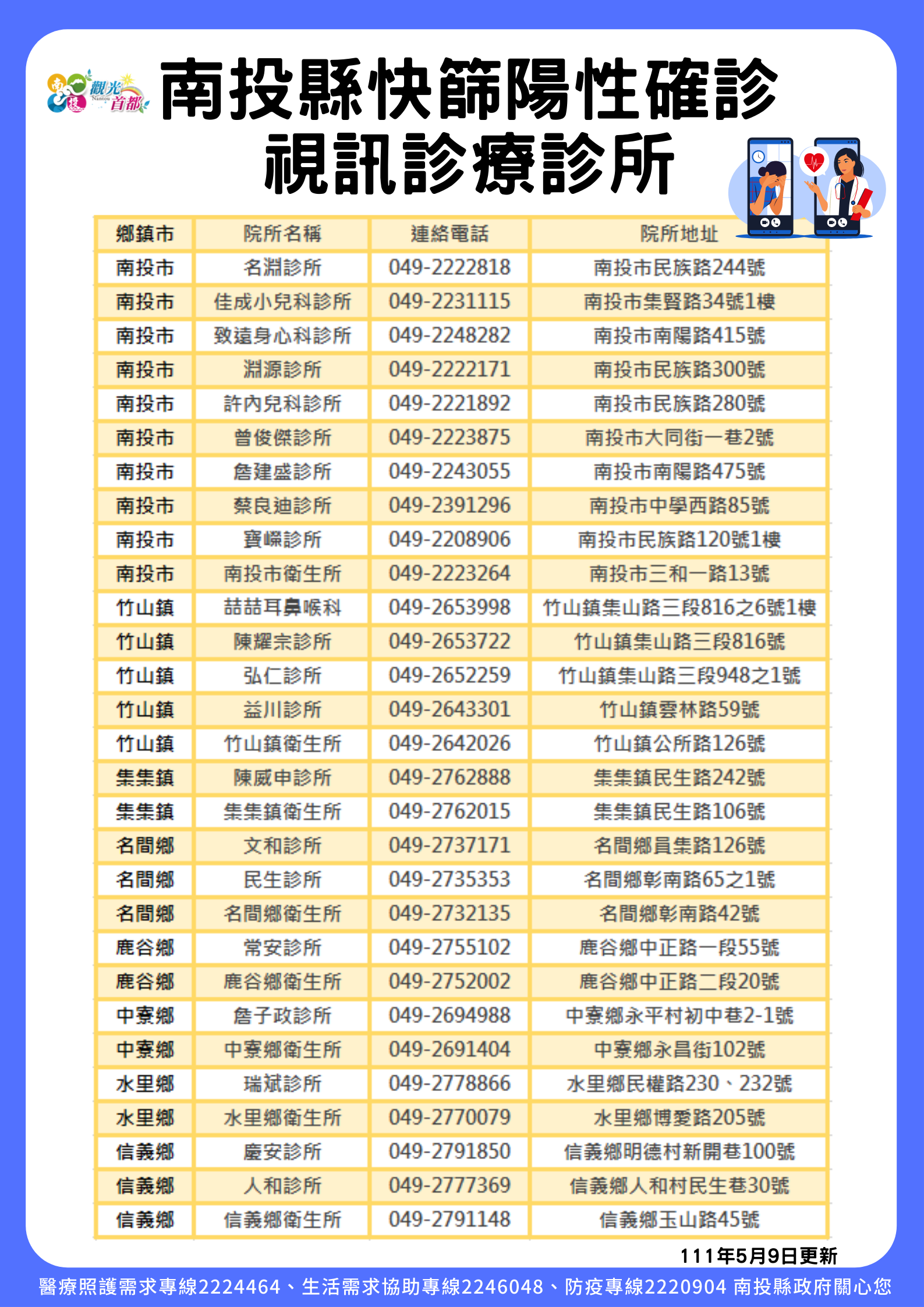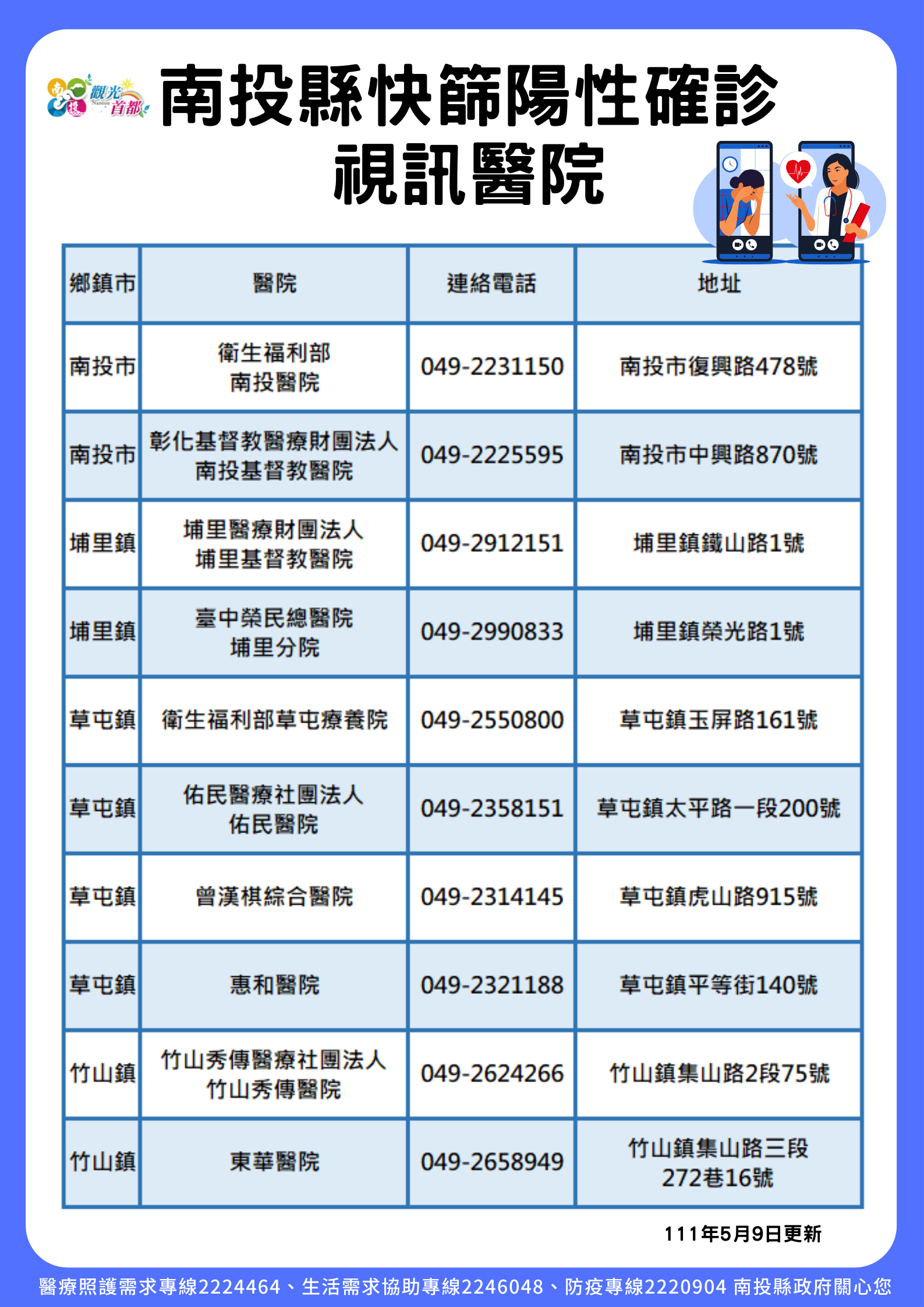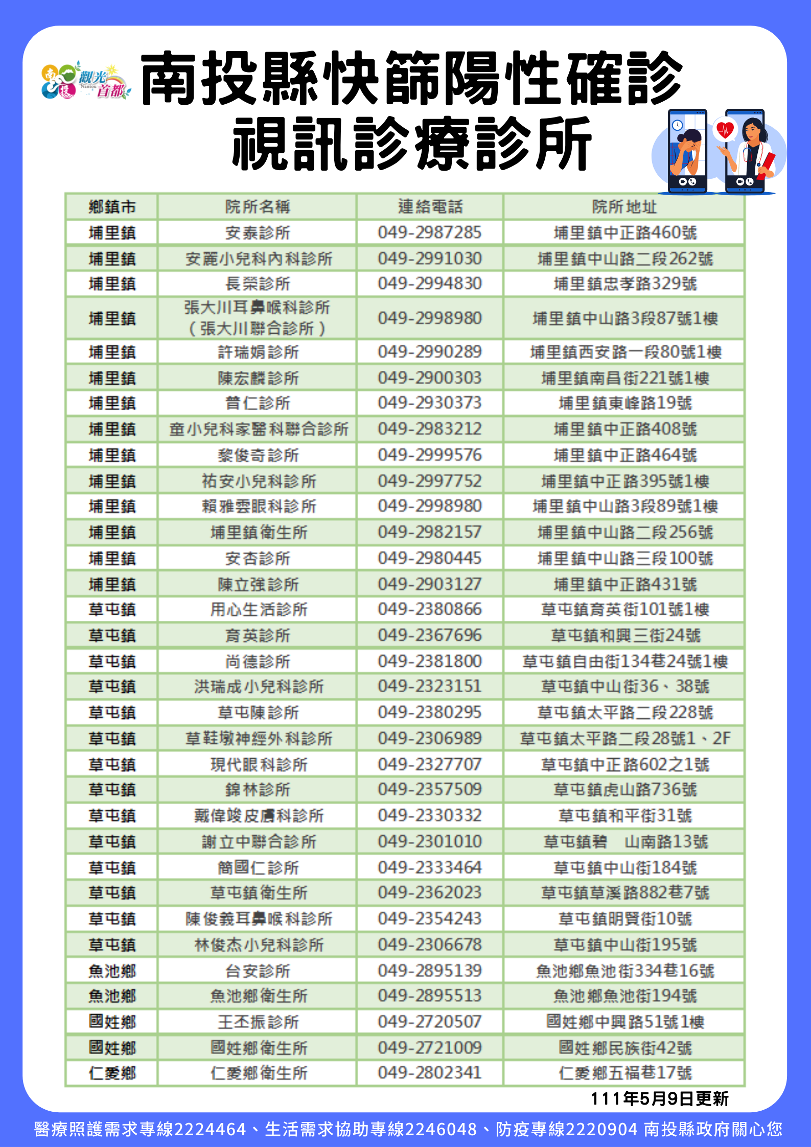 防疫宣傳 居家照護關懷手冊 防疫補助 勞工紓困 農漁畜牧 觀光紓困 企業紓困 租稅紓困 藝文紓困 中央各部會防疫專區 首頁 防疫宣傳 南投縣視訊診療診所及... 南投縣視訊診療診所及醫院 公佈單位:新聞及行政處 發佈日期:111/6/22