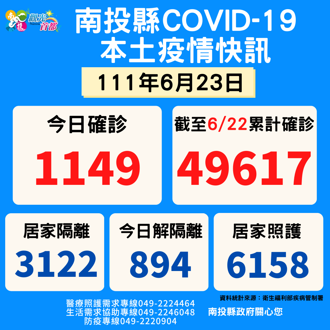 防疫宣傳 居家照護關懷手冊 防疫補助 勞工紓困 農漁畜牧 觀光紓困 企業紓困 租稅紓困 藝文紓困 中央各部會防疫專區 首頁 防疫宣傳 6月23日南投縣疫情... 6月23日南投縣疫情快訊 公佈單位:新聞及行政處 發佈日期:111/6/23