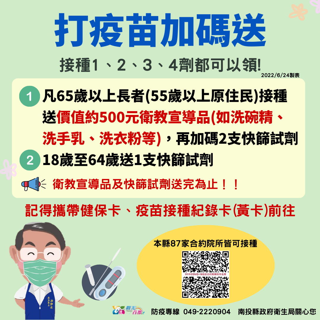 防疫宣傳 居家照護關懷手冊 防疫補助 勞工紓困 農漁畜牧 觀光紓困 企業紓困 租稅紓困 藝文紓困 中央各部會防疫專區 首頁 防疫宣傳 打疫苗加碼送 打疫苗加碼送 公佈單位:新聞及行政處 發佈日期:111/6/27