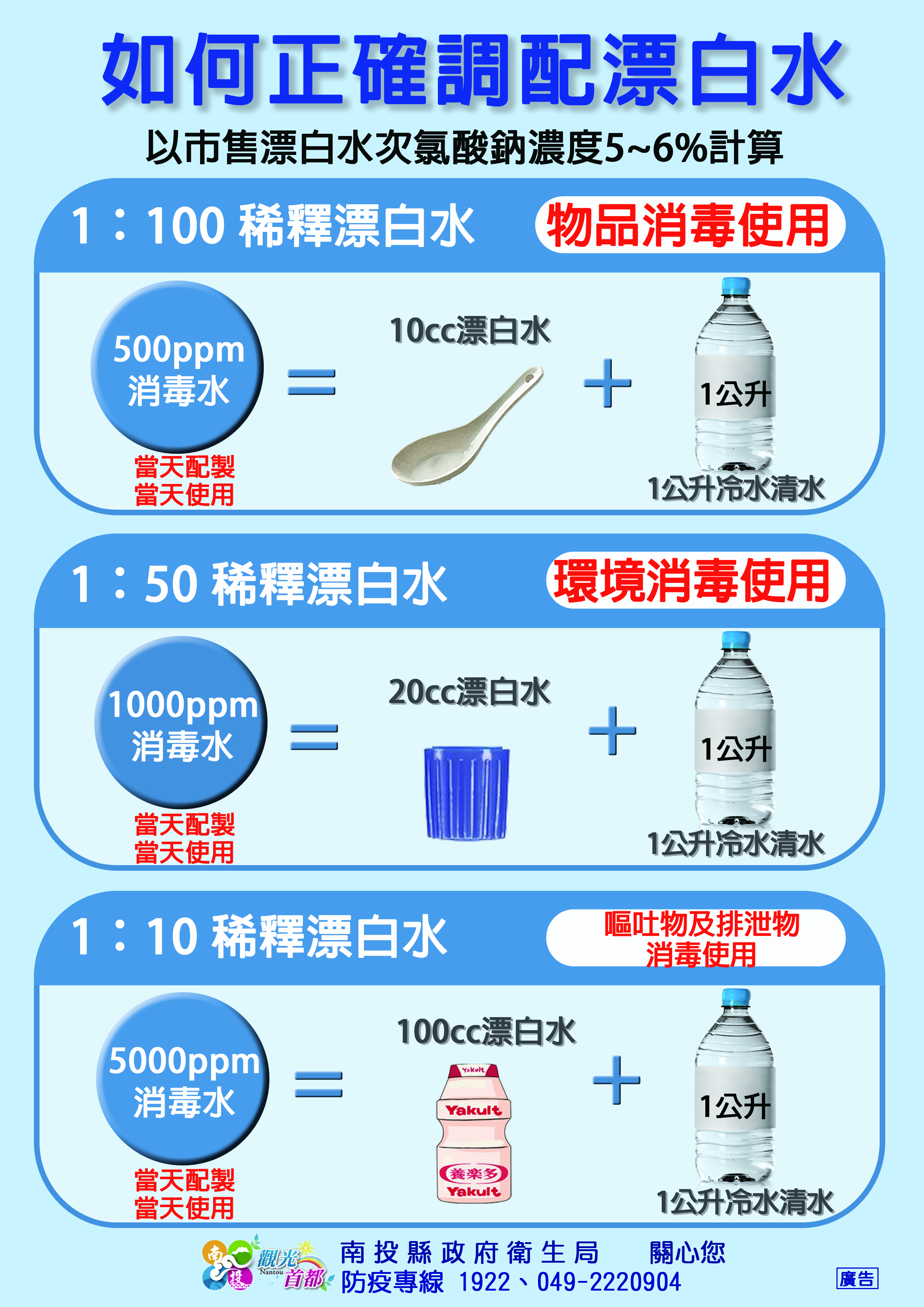 防疫宣傳 居家照護關懷手冊 防疫補助 勞工紓困 農漁畜牧 觀光紓困 企業紓困 租稅紓困 藝文紓困 中央各部會防疫專區 首頁 防疫宣傳 如何正確調配漂白水 如何正確調配漂白水 公佈單位:新聞及行政處 發佈日期:111/6/27