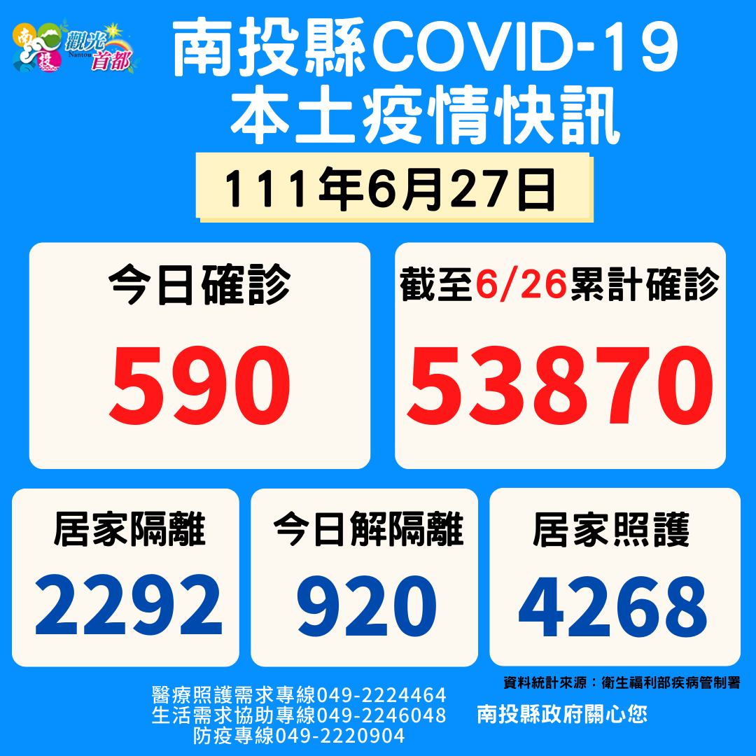 防疫宣傳 居家照護關懷手冊 防疫補助 勞工紓困 農漁畜牧 觀光紓困 企業紓困 租稅紓困 藝文紓困 中央各部會防疫專區 首頁 防疫宣傳 6月27日南投縣疫情... 6月27日南投縣疫情快訊 公佈單位:新聞及行政處 發佈日期:111/6/27