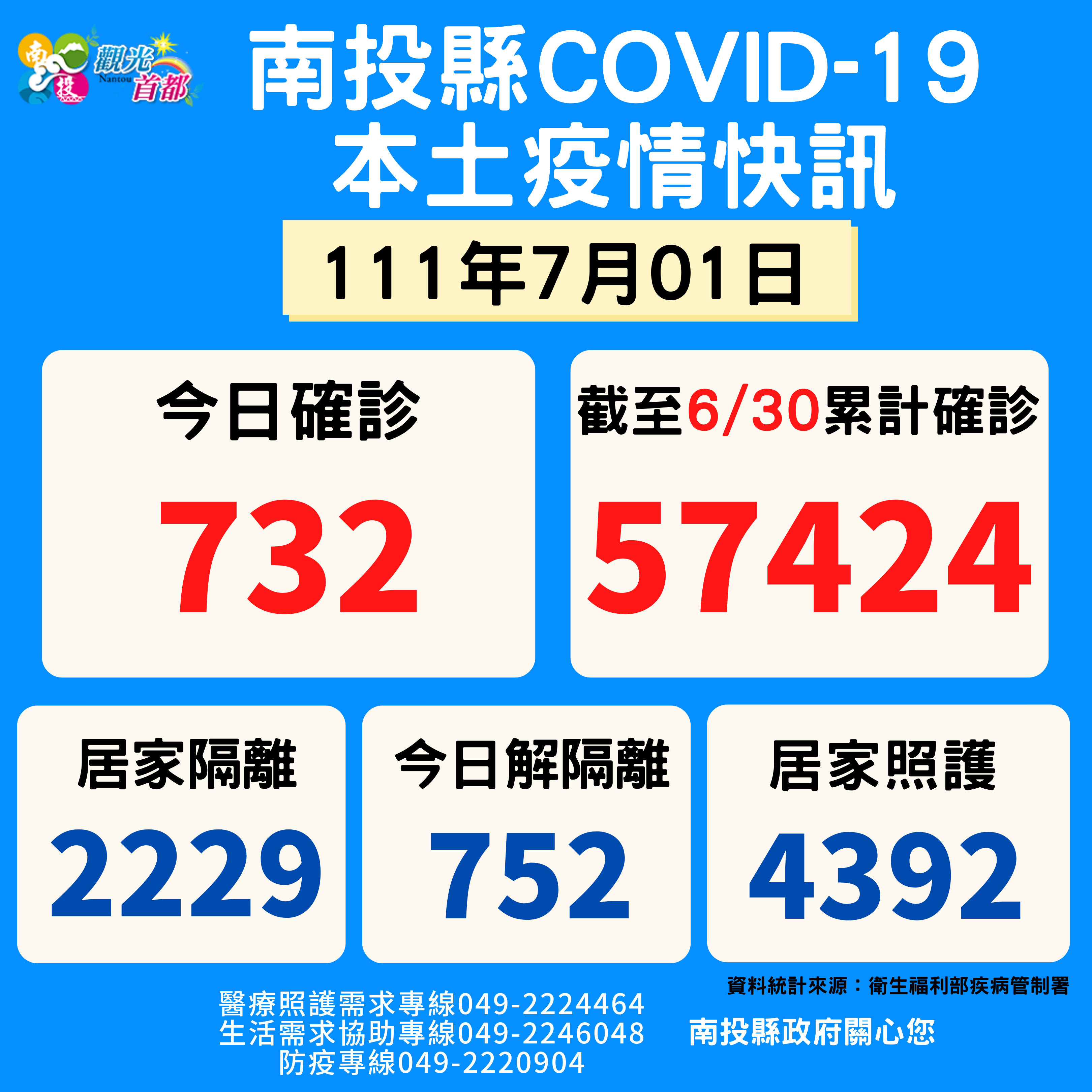 防疫宣傳 居家照護關懷手冊 防疫補助 勞工紓困 農漁畜牧 觀光紓困 企業紓困 租稅紓困 藝文紓困 中央各部會防疫專區 首頁 防疫宣傳 7月1日南投縣疫情快... 7月1日南投縣疫情快訊 公佈單位:新聞及行政處 發佈日期:111/7/1