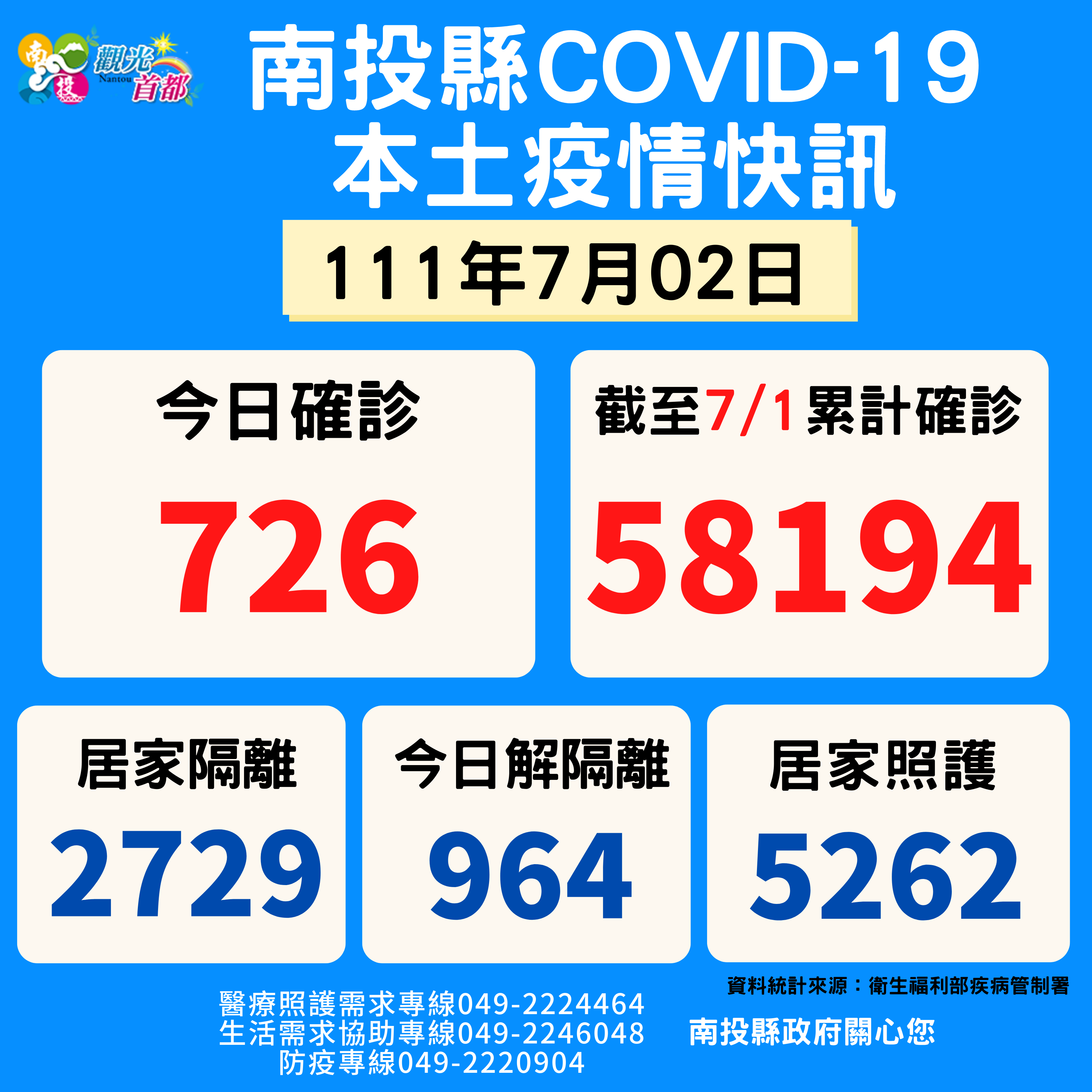 防疫宣傳 居家照護關懷手冊 防疫補助 勞工紓困 農漁畜牧 觀光紓困 企業紓困 租稅紓困 藝文紓困 中央各部會防疫專區 首頁 防疫宣傳 7月2南投縣疫情快訊 7月2南投縣疫情快訊 公佈單位:新聞及行政處 發佈日期:111/7/4