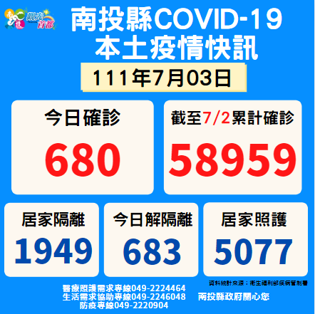 防疫宣傳 居家照護關懷手冊 防疫補助 勞工紓困 農漁畜牧 觀光紓困 企業紓困 租稅紓困 藝文紓困 中央各部會防疫專區 首頁 防疫宣傳 7月3南投縣疫情快訊 7月3南投縣疫情快訊 公佈單位:新聞及行政處 發佈日期:111/7/4