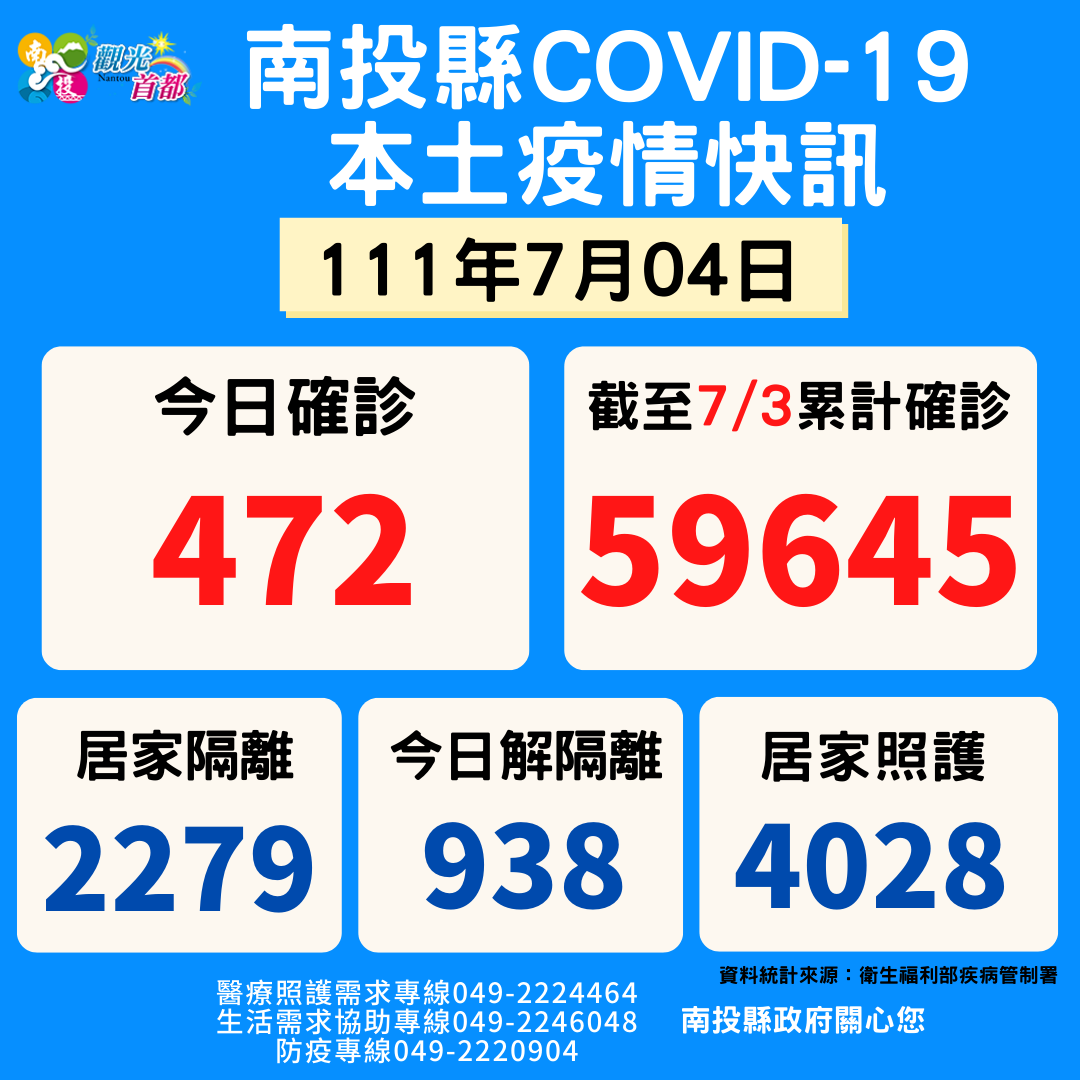 防疫宣傳 居家照護關懷手冊 防疫補助 勞工紓困 農漁畜牧 觀光紓困 企業紓困 租稅紓困 藝文紓困 中央各部會防疫專區 首頁 防疫宣傳 7月4南投縣疫情快訊 7月4南投縣疫情快訊 公佈單位:新聞及行政處 發佈日期:111/7/4