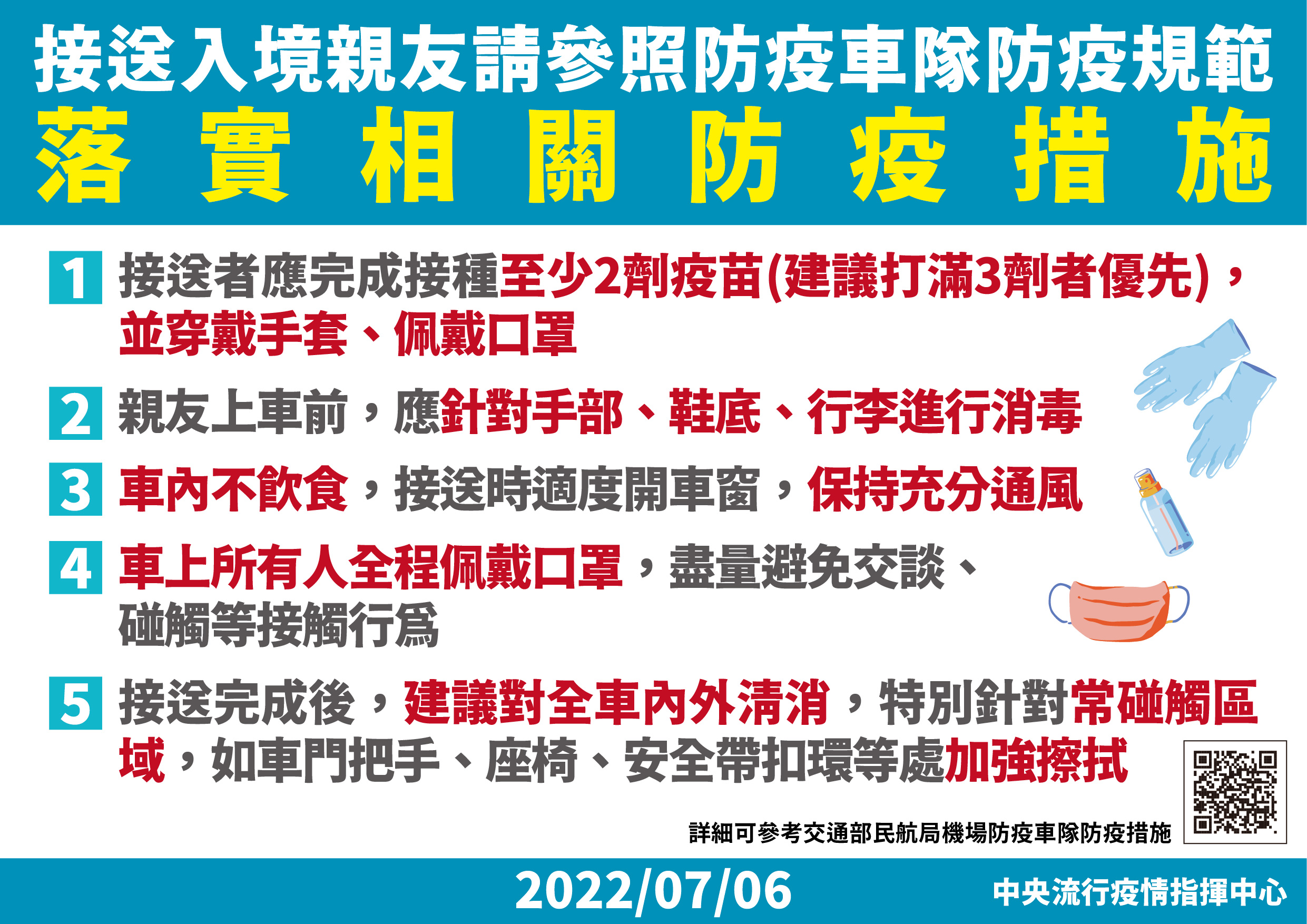 自111年6月15日起,旅客入境至檢疫處所的交通工具,除搭乘防疫車隊外,也可以由親友或機關團體車輛接送。提醒縣內民眾若前往機場接機,可參考下列5個接機防疫要領。1要:完整接種疫苗,接送者以打滿3劑者為優先,至少也應完成接種2劑疫苗。2要:穿戴手套,親友乘客上車前應針對手部、鞋底及行李進行消毒。3要:全程記得適度開車窗通風,車內不飲食,乘客應坐在駕駛座對角線後座,駕駛座應打開右前方窗戶,右後方的座椅則應打開左後方窗戶,氣流流動時會穿過駕駛於乘客之間,具有屏障效果。4要:車上所有乘客全程配戴口罩,避免交談、碰觸或坐在同一排座椅。5要:接送完成後,對乘客常碰觸區域,如車內外把手、座椅、安全帶扣等地方要加強擦拭及消毒。