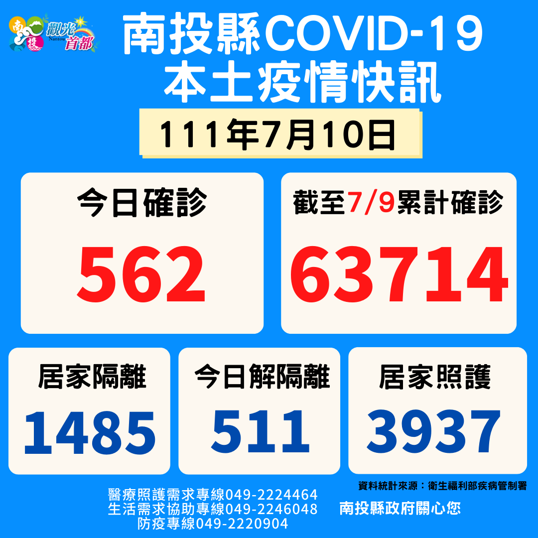防疫宣傳 居家照護關懷手冊 防疫補助 勞工紓困 農漁畜牧 觀光紓困 企業紓困 租稅紓困 藝文紓困 中央各部會防疫專區 首頁 防疫宣傳 7月10日南投縣疫情... 7月10日南投縣疫情快訊 公佈單位:新聞及行政處 發佈日期:111/7/11