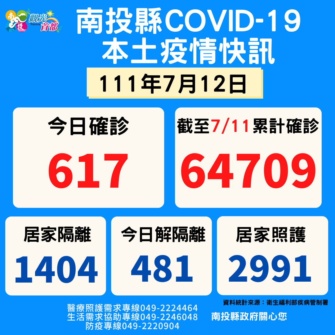 防疫宣傳 居家照護關懷手冊 防疫補助 勞工紓困 農漁畜牧 觀光紓困 企業紓困 租稅紓困 藝文紓困 中央各部會防疫專區 首頁 防疫宣傳 7月12日南投縣疫情... 7月12日南投縣疫情快訊 公佈單位:新聞及行政處 發佈日期:111/7/12