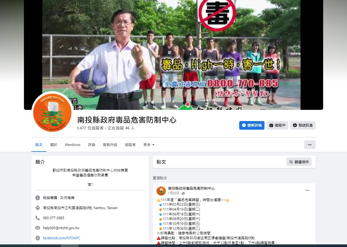 衛生局局長陳南松表示,為因應藥癮個案問題的多樣性,南投縣政府毒品危害防制中心規劃「藥癮醫療特色服務方案」,以家庭為中心服務模式,評估藥癮施用者與家庭需求,媒合相關社會福利、就醫、戒治、社會與心理評估處遇或家族會談與輔導等資源,建置以醫療及復歸社會為核心服務,提供藥癮者適切服務,今年起迄今毒防中心已提供62人次服務。衛生局在臉書有南投縣毒品防制中心粉絲專頁,提供毒藥癮防制訊息、戒治醫療資源或活動課程的資訊,歡迎民眾踴躍前往,並請按讚分享臉書粉絲頁:https://www.facebook.com/NTDAPC。