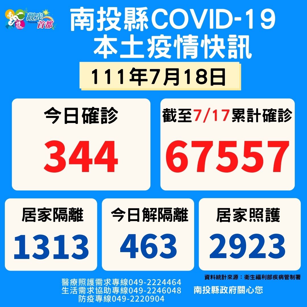 防疫宣傳 居家照護關懷手冊 防疫補助 勞工紓困 農漁畜牧 觀光紓困 企業紓困 租稅紓困 藝文紓困 中央各部會防疫專區 首頁 防疫宣傳 7月18日南投縣疫情... 7月18日南投縣疫情快訊 公佈單位:新聞及行政處 發佈日期:111/7/18