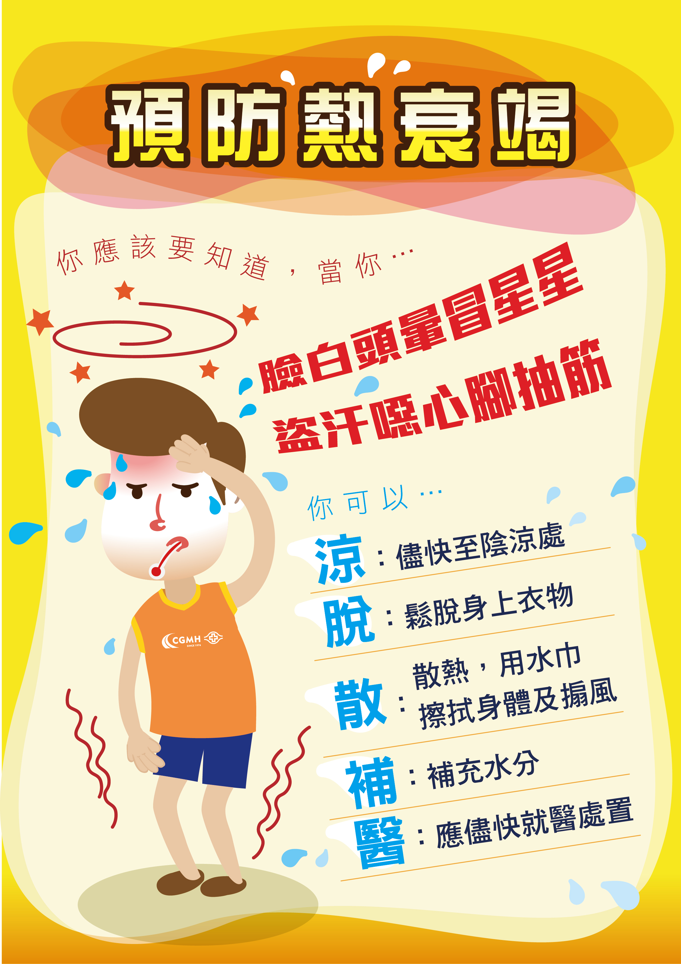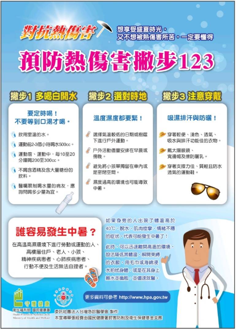 陳南松局長提醒,當發現身體疑似出現熱傷害徵兆時,如體溫升高、皮膚乾熱變紅、心跳加速,嚴重者會出現無法流汗、頭痛、頭暈、噁心、嘔吐,甚至神智混亂、抽筋、昏迷等症狀,務必迅速離開高溫的環境、設法降低體溫(如移至陰涼處、鬆脫衣物、用水擦拭身體或搧風等)、提供加少許鹽的冷開水或稀釋的電解質飲料,一邊降溫一邊以最快的速度送醫。