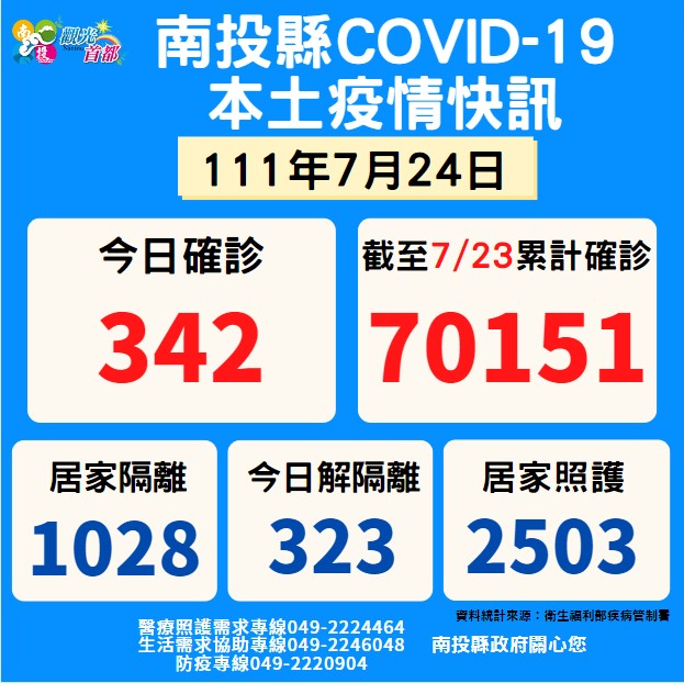 防疫宣傳 居家照護關懷手冊 防疫補助 勞工紓困 農漁畜牧 觀光紓困 企業紓困 租稅紓困 藝文紓困 中央各部會防疫專區 首頁 防疫宣傳 7月24日南投縣疫情... 7月24日南投縣疫情快訊 公佈單位:新聞及行政處 發佈日期:111/7/25