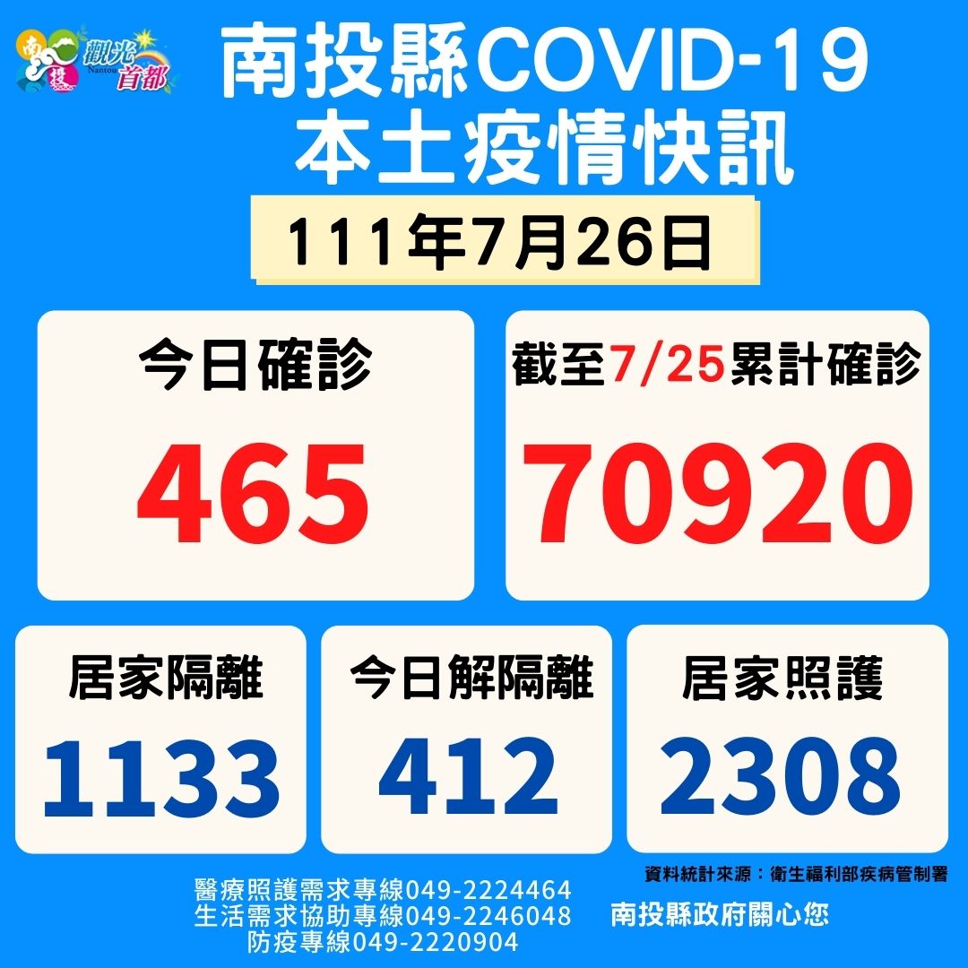 防疫宣傳 居家照護關懷手冊 防疫補助 勞工紓困 農漁畜牧 觀光紓困 企業紓困 租稅紓困 藝文紓困 中央各部會防疫專區 首頁 防疫宣傳 7月26日南投縣疫情... 7月26日南投縣疫情快訊 公佈單位:新聞及行政處 發佈日期:111/7/26
