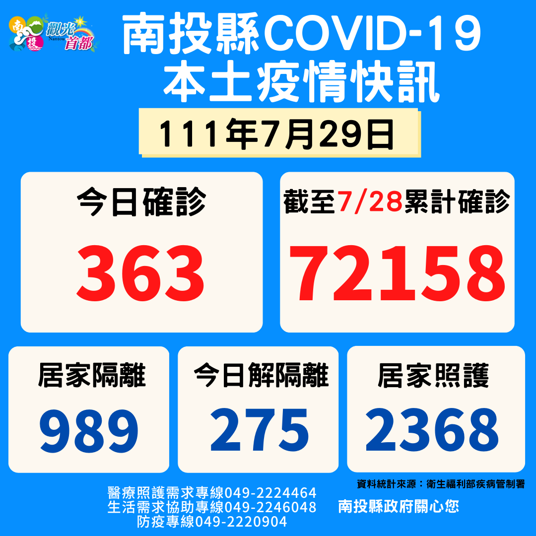 防疫宣傳 居家照護關懷手冊 防疫補助 勞工紓困 農漁畜牧 觀光紓困 企業紓困 租稅紓困 藝文紓困 中央各部會防疫專區 首頁 防疫宣傳 7/29南投縣疫情快... 7/29南投縣疫情快訊 公佈單位:新聞及行政處 發佈日期:111/7/29