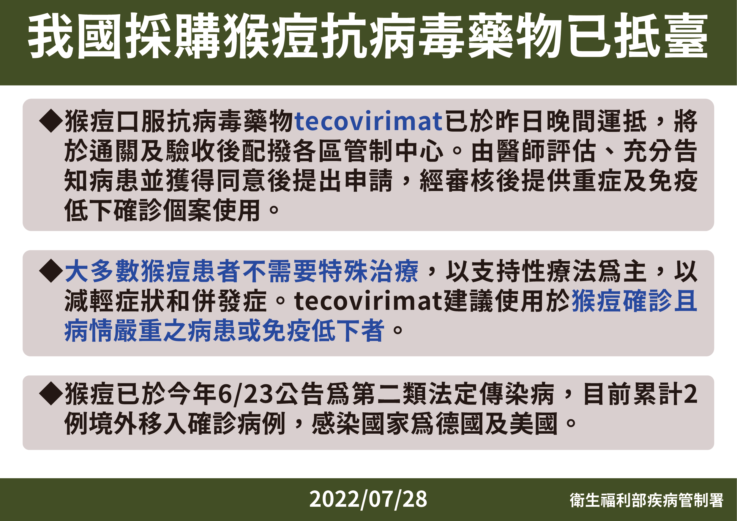 防疫宣傳 居家照護關懷手冊 防疫補助 勞工紓困 農漁畜牧 觀光紓困 企業紓困 租稅紓困 藝文紓困 中央各部會防疫專區 首頁 防疫宣傳 我國採購猴痘抗病毒藥... 我國採購猴痘抗病毒藥物已抵臺 公佈單位:新聞及行政處 發佈日期:111/7/29