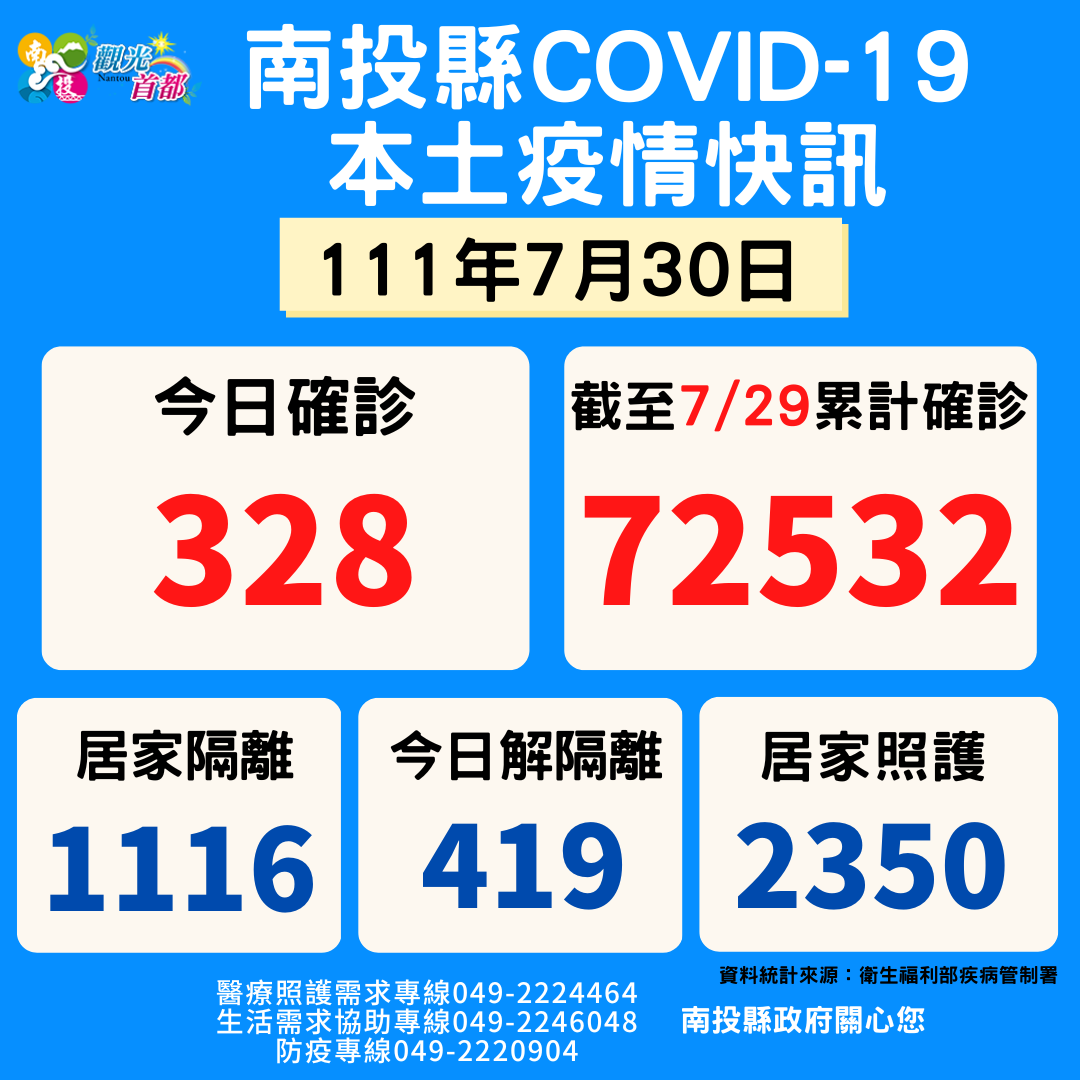 防疫宣傳 居家照護關懷手冊 防疫補助 勞工紓困 農漁畜牧 觀光紓困 企業紓困 租稅紓困 藝文紓困 中央各部會防疫專區 首頁 防疫宣傳 7月30日南投縣疫情... 7月30日南投縣疫情快訊 公佈單位:新聞及行政處 發佈日期:111/8/1