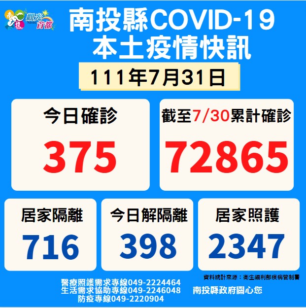 防疫宣傳 居家照護關懷手冊 防疫補助 勞工紓困 農漁畜牧 觀光紓困 企業紓困 租稅紓困 藝文紓困 中央各部會防疫專區 首頁 防疫宣傳 7月31日南投縣疫情... 7月31日南投縣疫情快訊 公佈單位:新聞及行政處 發佈日期:111/8/1