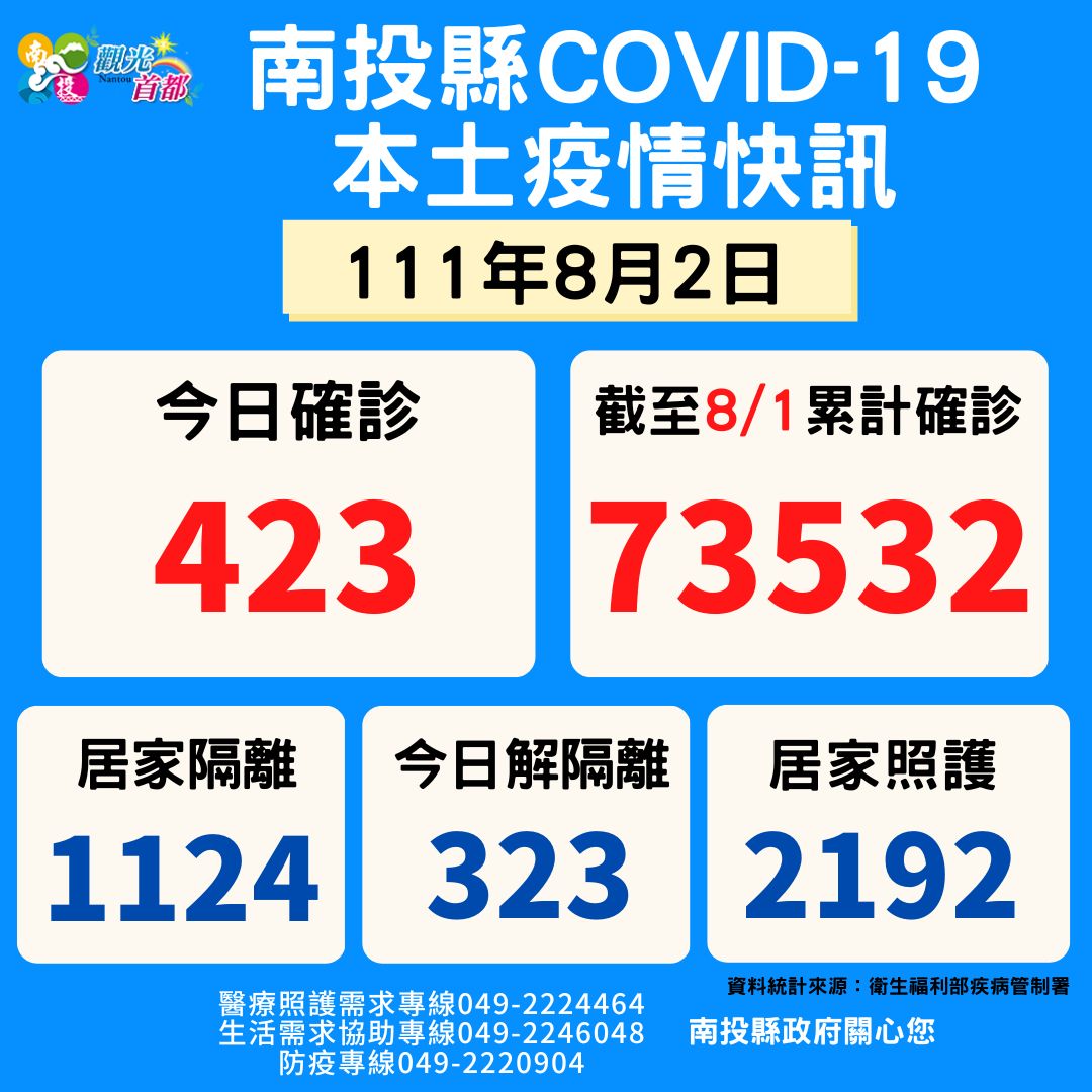 防疫宣傳 居家照護關懷手冊 防疫補助 勞工紓困 農漁畜牧 觀光紓困 企業紓困 租稅紓困 藝文紓困 中央各部會防疫專區 首頁 防疫宣傳 8月2日南投縣疫情快... 8月2日南投縣疫情快訊 公佈單位:新聞及行政處 發佈日期:111/8/2