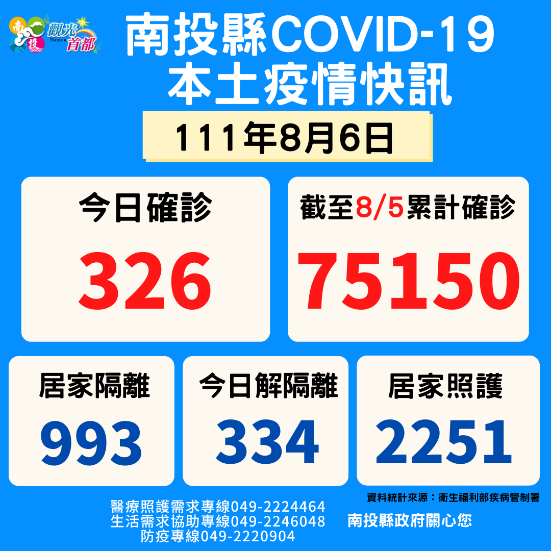 防疫宣傳 居家照護關懷手冊 防疫補助 勞工紓困 農漁畜牧 觀光紓困 企業紓困 租稅紓困 藝文紓困 中央各部會防疫專區 首頁 防疫宣傳 8/6南投縣疫情快訊 8/6南投縣疫情快訊 公佈單位:新聞及行政處 發佈日期:111/8/6