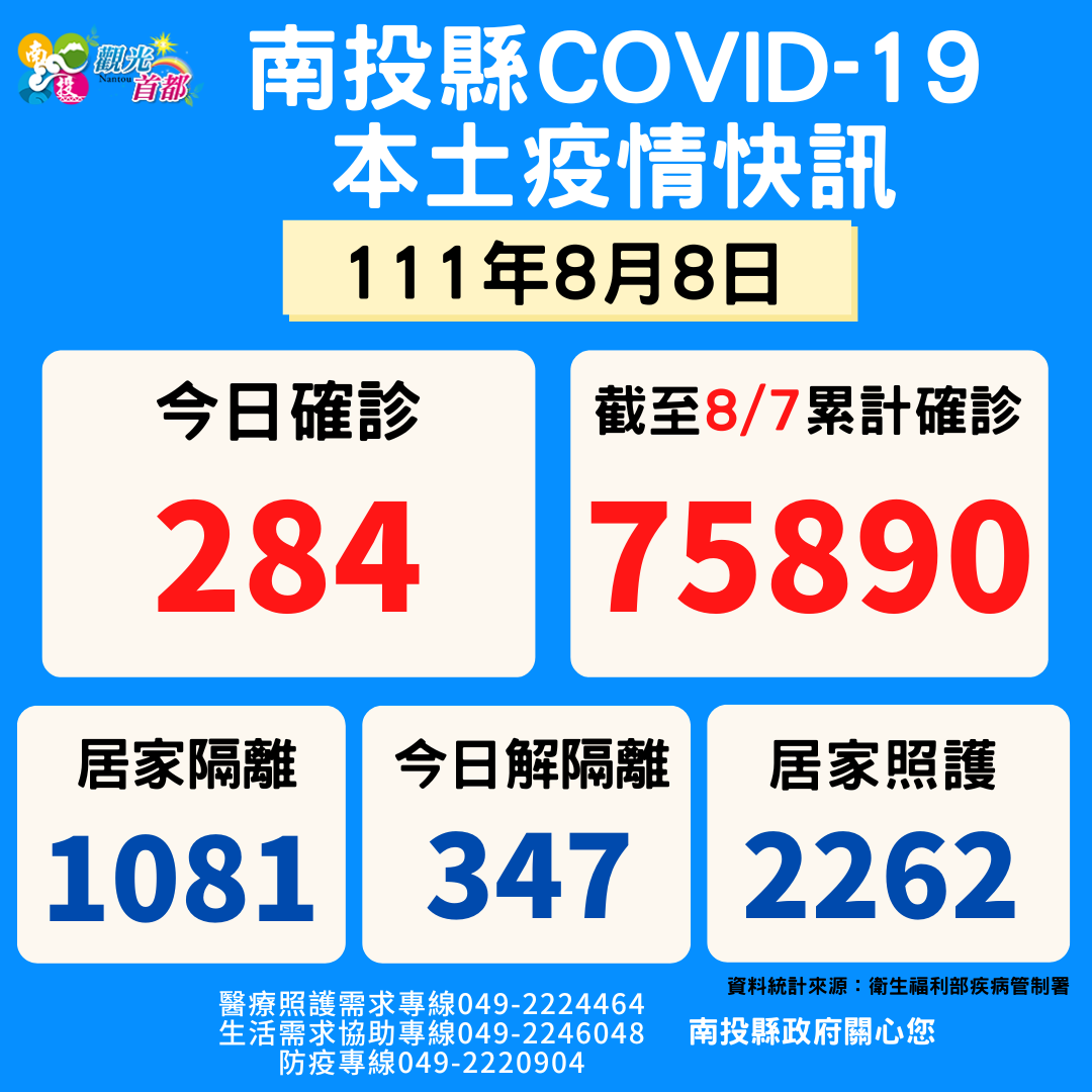 防疫宣傳 居家照護關懷手冊 防疫補助 勞工紓困 農漁畜牧 觀光紓困 企業紓困 租稅紓困 藝文紓困 中央各部會防疫專區 首頁 防疫宣傳 8/8南投縣疫情快訊 8/8南投縣疫情快訊 公佈單位:新聞及行政處 發佈日期:111/8/8