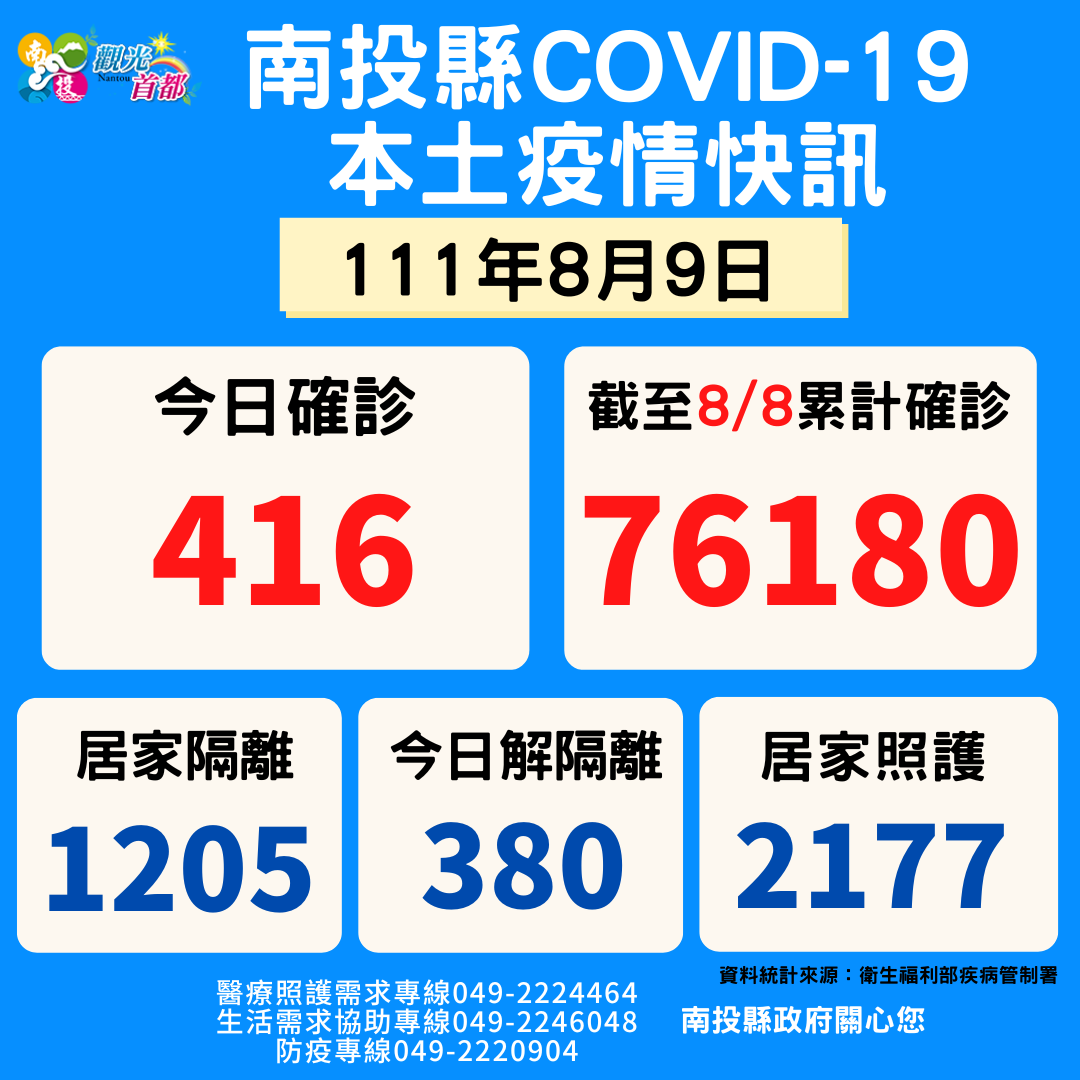 防疫宣傳 居家照護關懷手冊 防疫補助 勞工紓困 農漁畜牧 觀光紓困 企業紓困 租稅紓困 藝文紓困 中央各部會防疫專區 首頁 防疫宣傳 8/9南投縣疫情快訊 8/9南投縣疫情快訊 公佈單位:新聞及行政處 發佈日期:111/8/9