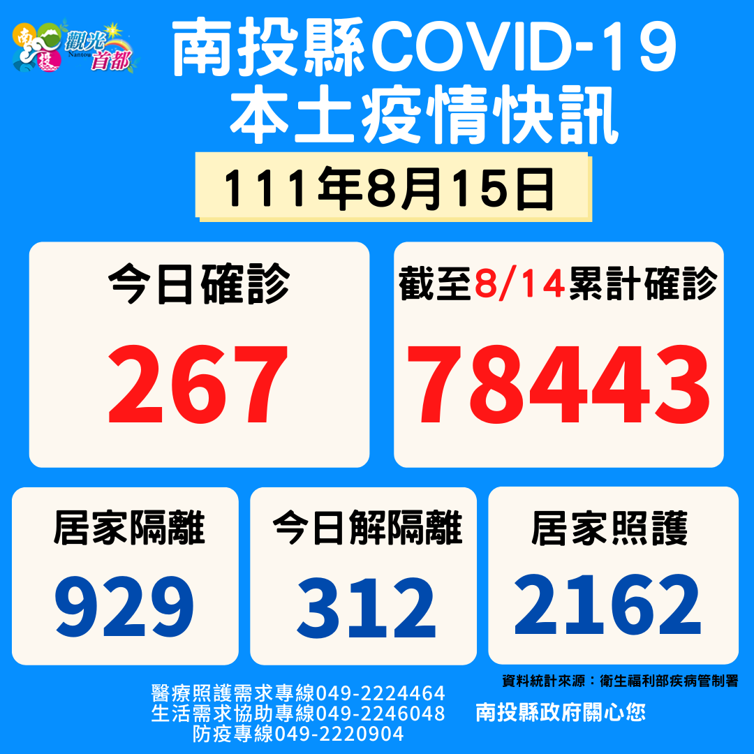 防疫宣傳 居家照護關懷手冊 防疫補助 勞工紓困 農漁畜牧 觀光紓困 企業紓困 租稅紓困 藝文紓困 中央各部會防疫專區 首頁 防疫宣傳 8月15日南投縣疫情... 8月15日南投縣疫情快訊 公佈單位:新聞及行政處 發佈日期:111/8/15