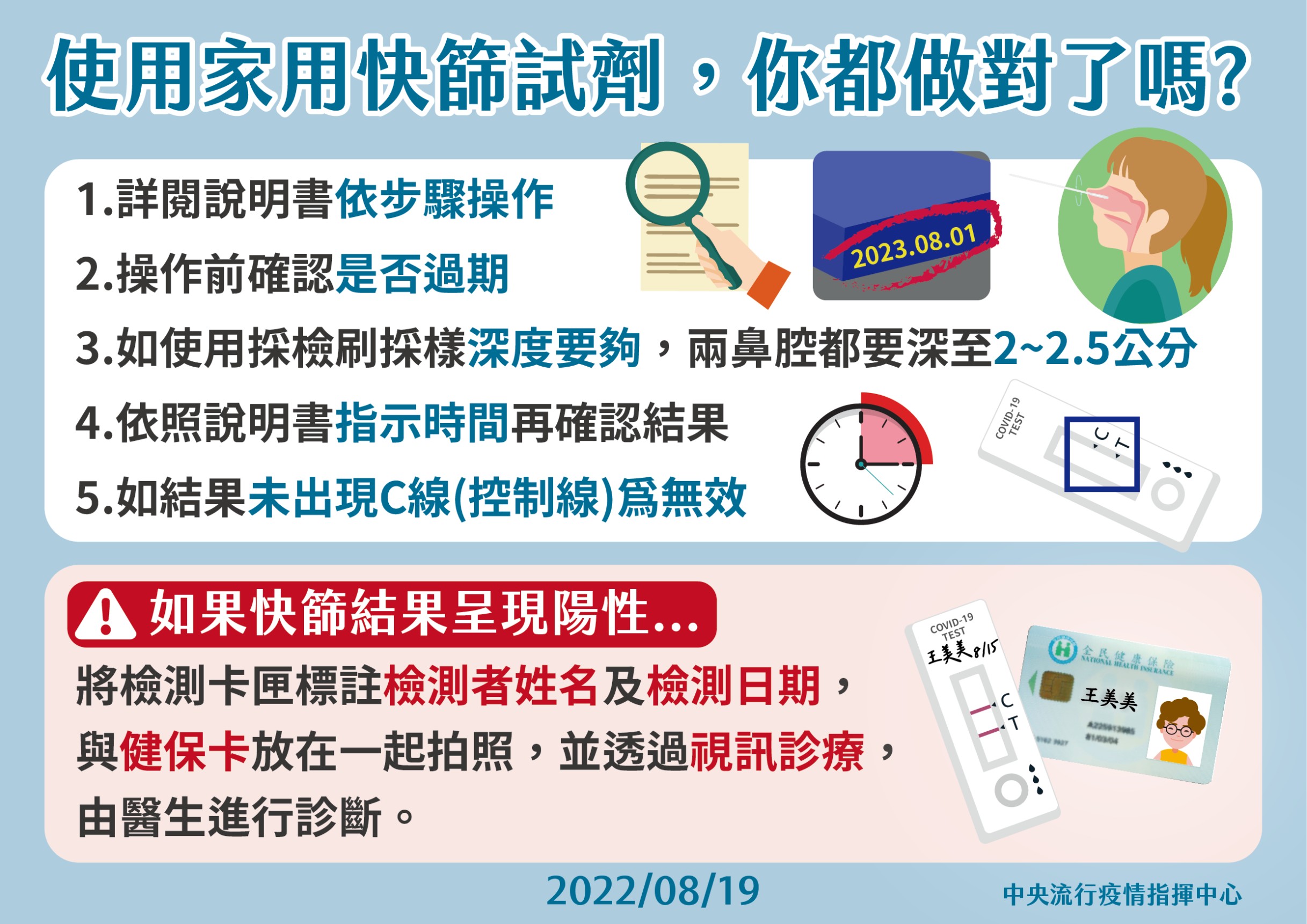 南投縣衛生局陳南松局長提醒民眾,使用家用快篩試劑時,切記要詳閱快篩試劑說明書,並依步驟操作,採檢時雙鼻腔深度約2~2.5公分,等待時間約15-30分鐘,如快篩結果呈陽性(雙條線),將檢測卡匣上寫上檢測者姓名與採檢日期,並與健保卡放在一起拍照,透過電話視訊診療院所醫師進行診斷,即早隔離治療,避免發生家庭或職場群聚感染。本縣提供視訊診療醫療院所,可至本局網站查詢:https://reurl.cc/605NkZ。